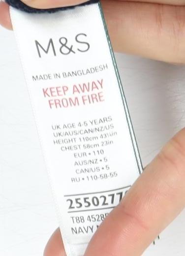 This stylish pullover hoodie from Marks and Spencer is perfect for any little adventurer. Designed in a bold blue striped pattern, it features a fun dinosaur theme that is sure to appeal to young boys. Made for comfort and durability, this hoodie is crafted from a blend of cotton, elastane, and viscose, ensuring it provides warmth and flexibility for all day wear. The attached hood and long sleeves make it ideal for cooler spring and autumn days, while the regular fit and crew neck offer a classic, comfortable style.The hoodie is part of the Boys collection, designed with both style and practicality in mind. The pullover closure and machine washable fabric make it easy to wear and maintain, perfect for everyday casual occasions. Additionally, the embroidered dinosaur logo adds a playful accent that kids will love.Sized for children aged 4-5 years, this hoodie has a chest size of approximately 53 cm, offering a regular fit that accommodates the active lifestyle of young children. Whether they're heading to school or the park, this hoodie is an excellent choice to keep them comfortable and looking great. Don't miss out on this versatile and attractive piece from Marks and Spencer, available now at an excellent price.