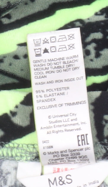 Add a prehistoric touch to your boy’s nightwear collection with these striking Marks and Spencer Jurassic Park pyjama pants. Designed for comfort and durability, these soft jersey pyjama bottoms feature an eye-catching graphic print of dinosaur motifs against a green stone-effect background, complete with vibrant neon scratch accents that add a burst of character. Crafted from a blend of 95% polyester and 5% elastane, they offer a soft, smooth feel with just the right amount of stretch to ensure comfortable movement through sleep and lounging.Perfect for Jurassic Park fans, these pyjama pants embody excitement and comfort in one package. The elasticated waistband provides a secure yet flexible fit, ideal for active nights or relaxed weekends. Ribbed ankle cuffs help keep the fit snug, preventing the legs from riding up while sleeping. Easy to care for, these pyjama bottoms are machine washable and maintain their vibrant print even after repeated washes.Suitable for boys aged 13-14 years, these pyjama pants have been carefully designed with both practicality and style in mind. The fun graphic design brings the thrilling Jurassic Park adventure home, making bedtime more enjoyable. Whether worn on their own or as part of a two-piece set, these pyjama bottoms are an excellent choice for fans of dinosaurs and adventure alike.Marks and Spencer is renowned for its quality and comfort, and these nightwear bottoms are no exception. With a soft, breathable jersey fabric, they’re perfect for year-round comfort, especially during the cooler seasons. The lightweight material ensures ease of wear and long-lasting comfort throughout the night. In excellent pre-loved condition with no visible flaws, these pyjama pants are ready for many more cosy nights ahead.Ideal as a gift or a practical addition to your child’s nightwear rotation, these Jurassic Park pyjamas promise both comfort and fun at bedtime.