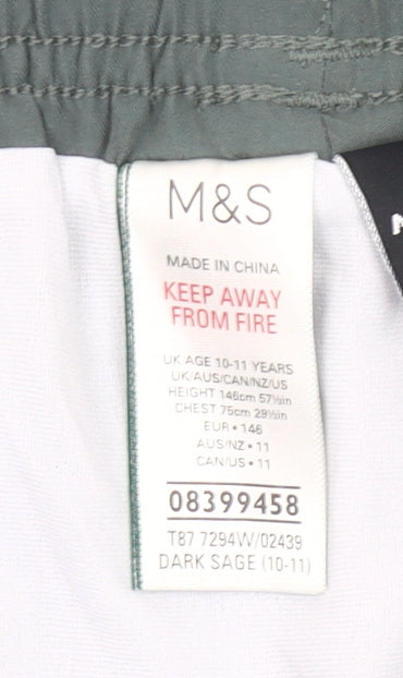 Upgrade your young gamer's summer wardrobe with these officially licensed Minecraft swim shorts from Marks and Spencer. Stylish, comfortable, and durable, these shorts are crafted from 100% polyester, designed with a lightweight and quick-drying microfibre finish that makes them perfect for water-based activities. Featuring an elasticated waist with a functional drawstring fastening for a secure fit, they deliver both comfort and practicality for everyday wear. The shorts are styled in a dark sage green colourway with bold Minecraft graphics and logos printed on the front, making them a fantastic choice for fans of the popular video game. The flat front design and regular fit ensure a casual yet polished look, while the practical back pocket adds functionality. Whether worn at the beach, pool, or during holiday adventures, these shorts are versatile and ideal for active play in warmer weather.Specifically designed for ages 10-11 years with a waist size of 57 cm and EUR 146 equivalent sizing, they provide a comfortable and age-appropriate fit. The mid-rise style ensures extra comfort while swimming or relaxing. Easy to care for, these shorts are machine washable and suitable for repeated use, always maintaining their vibrant colour and quality.Perfect for spring and summer, these Minecraft shorts make a great gift for birthdays, holidays, or any young Minecraft enthusiast. With quick-drying properties and durable fabric, they are built to withstand activewear conditions, making them a reliable wardrobe essential. Combining practicality, style, and fun character appeal, these Marks and Spencer shorts are a must-have for kids who love gaming and adventure.Whether at the beach, poolside, or water park, these shorts will keep your child comfortable while showing off their favourite game-inspired design. A blend of fashion and function, they offer unbeatable value as a high-quality, branded piece of children's activewear that’s guaranteed to be a hit this season.