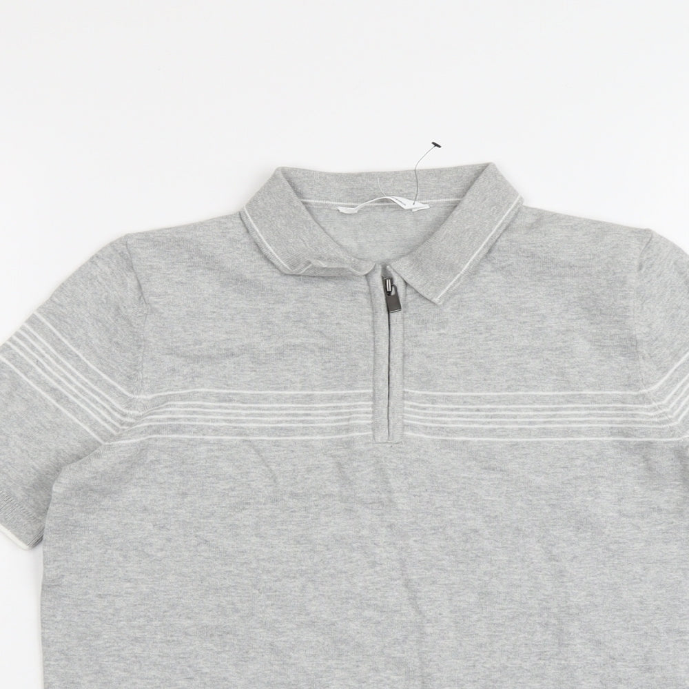 Boys Grey Striped Cotton Pullover Polo Size 12-13 Years Collared Zip