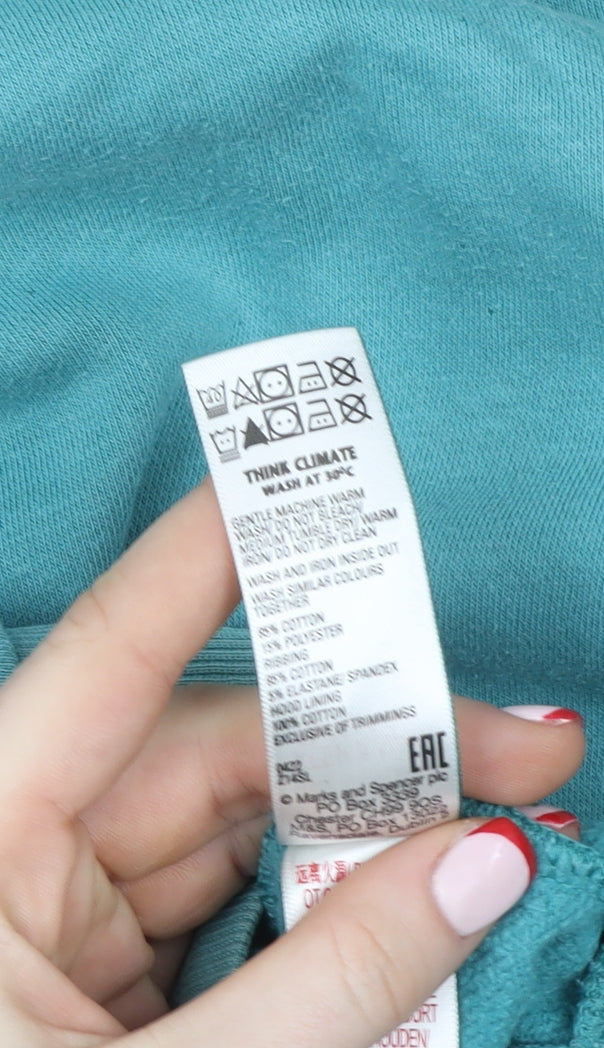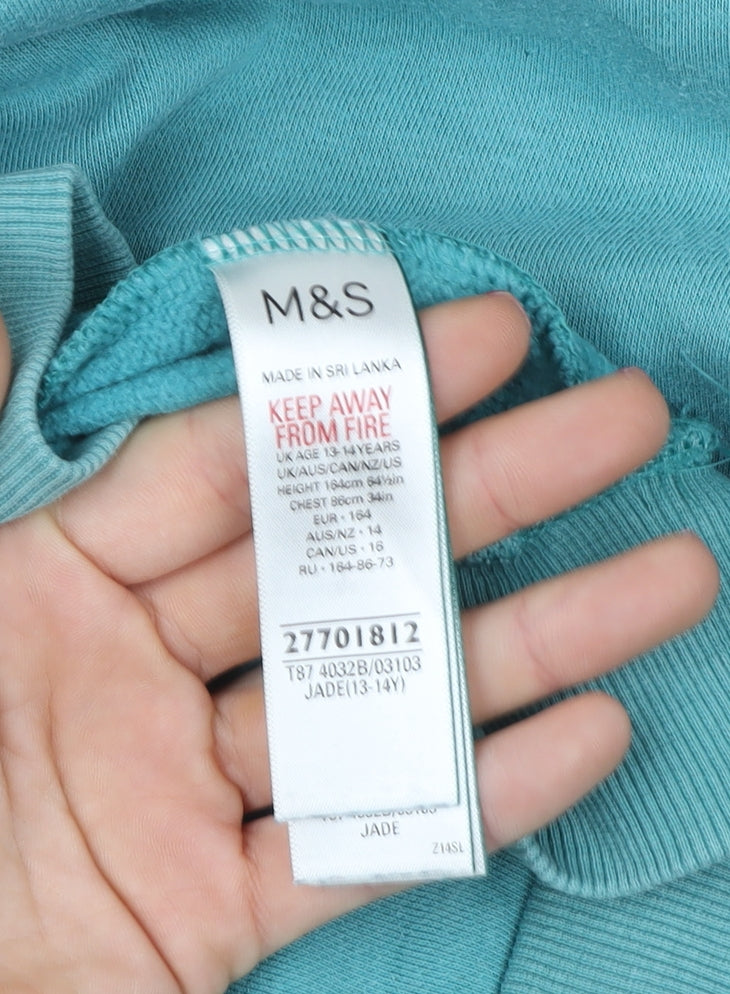 Keep your young gamer cosy and stylish with this Marks and Spencer Boys Pullover Hoodie in a cool jade green colour. Designed for ages 13-14 years, this hoodie offers a relaxed and comfortable fit, making it ideal for everyday wear, lounging, or schooldays. Crafted from a soft and breathable cotton blend (85% cotton, 15% polyester), it provides warmth without being too heavy, perfect for layering during autumn, winter, or spring. The playful 'GAME OVER – PLAY AGAIN' graphic print across the chest adds a trendy and fun gamer-inspired touch that kids will love.The hoodie features long sleeves, a classic crew neckline, and a kangaroo pocket for practicality and style. Its pullover closure ensures easy dressing, while the ribbed cuffs and hem add durability and shape retention. The jersey fabric lends a smooth, quality feel against the skin, and it’s easy to care for—machine washable for modern family convenience.Marks and Spencer’s attention to quality ensures a garment that holds up well to active use, allowing your child freedom of movement whether they’re gaming, playing outside, or simply relaxing. The bright jade green shade provides a fresh pop of colour that complements casual outfits effortlessly, pairing well with jeans, joggers, or shorts.This hoodie remains in very good used condition, showing only minimal signs of wear and no stains, holes, or fading. It’s an excellent choice for parents looking for reliable comfort, fun design, and trusted Marks and Spencer quality at an affordable price.Bring home this playful and comfortable ‘GAME OVER’ hoodie to keep your child warm, confident, and on-trend all season long — perfect for the young gamer who loves to stay cosy while expressing their personality.