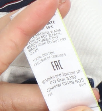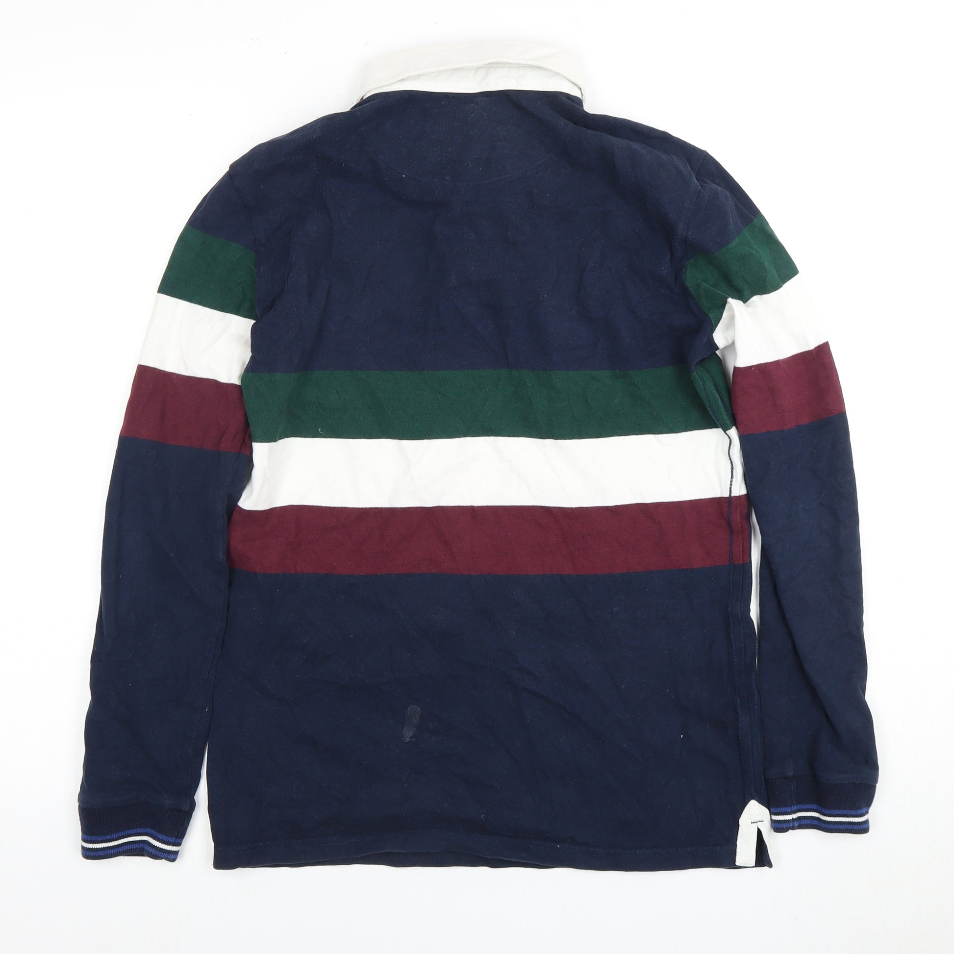 This Marks and Spencer Boys Polo Shirt, sized for ages 13-14 years, is a classic addition to any young boy’s wardrobe. Crafted from 100% cotton, it offers comfort and breathability for casual outings. Featuring a vibrant multicoloured striped pattern, this shirt brings a touch of fun and energy to any outfit. The collared neckline and button closure provide a traditional polo style, making it versatile for various occasions. Although it shows minor wear, including a small hole, it remains in good condition, ideal for everyday use. Machine washable for easy care, this long sleeve polo shirt is perfect for cooler seasons, allowing for layering or solo wear. Get a taste of timeless style and practicality with this quality piece from a trusted brand.