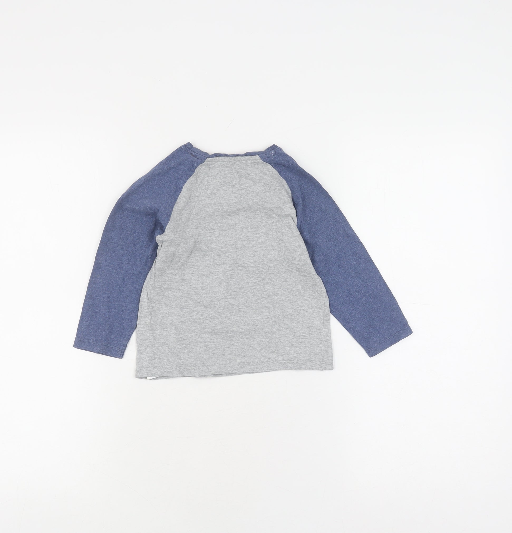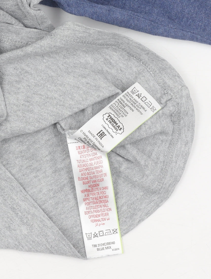 Invite your little one on an adventure with this charming Marks and Spencer boys' long sleeve T-shirt. Perfect for a young Thomas & Friends fan, this delightful top showcases a graphic print of Thomas the Tank Engine set against a stylish blue and grey backdrop. Crafted entirely from cosy cotton, it offers a soft and breathable wear, ideal for all seasons. The regular fit, complemented by a classic crew neckline, ensures a comfortable and easy-going style for day-to-day activities. With its durable material and easy pullover design, it's perfect for dressing up or down, be it for a casual day out or a playful indoor session. Not only is it machine washable for effortless maintenance, but it also comes with the trusted quality of Marks and Spencer, known for combining comfort with fashion. Although previously owned, the top is in excellent condition, ready to be adored by your little rail enthusiast. Get ready to make any day fun and colourful with this adorable Thomas & Friends T-shirt, a full outfit in one piece!