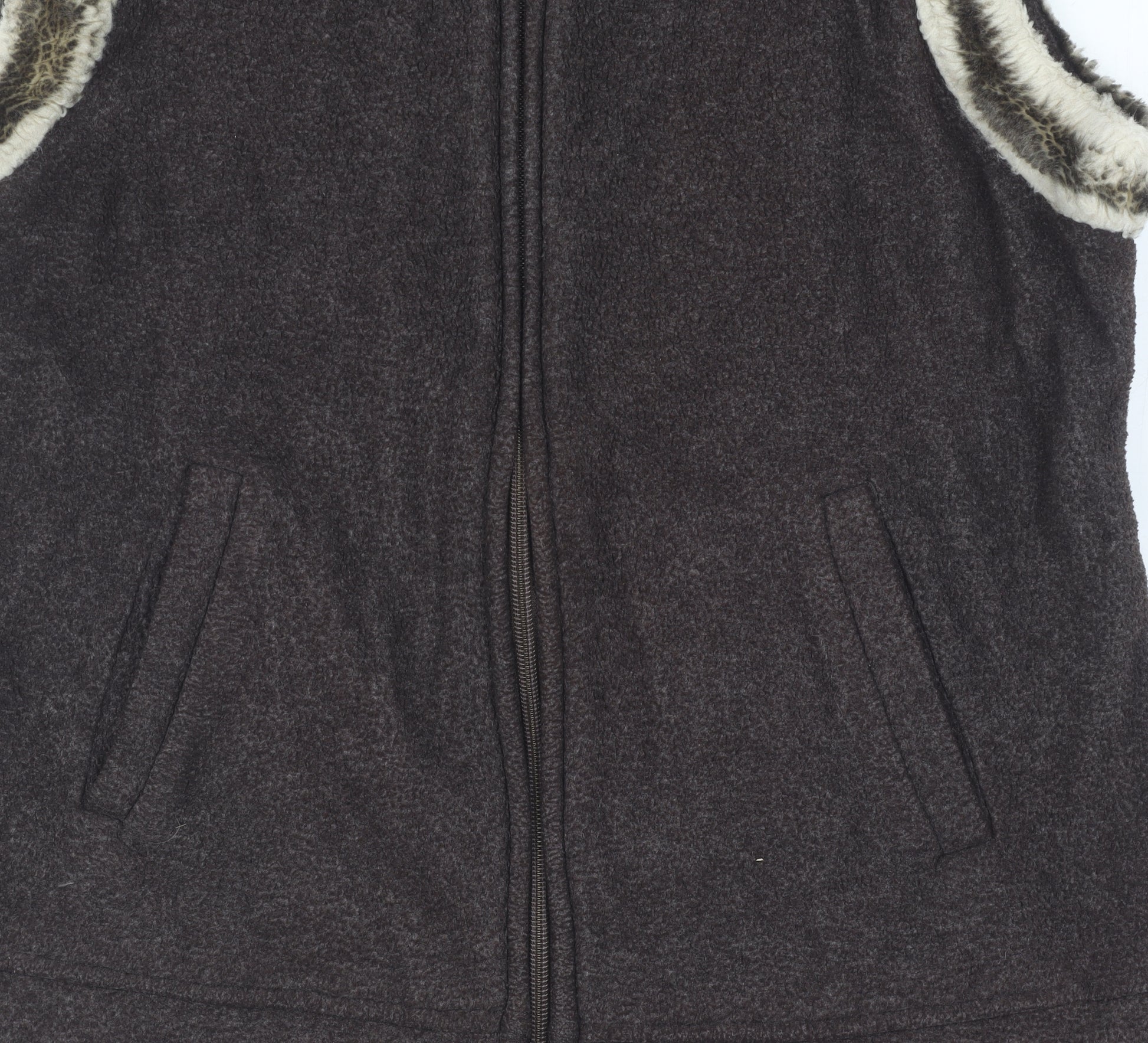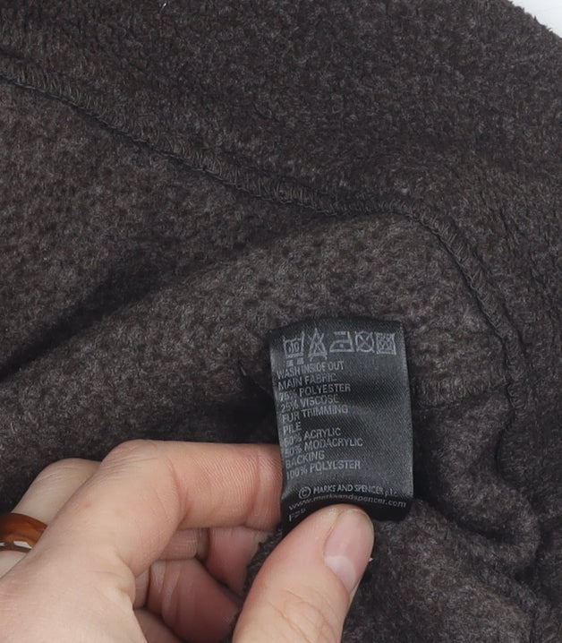 Discover timeless elegance and effortless comfort with this Marks and Spencer brown waistcoat, designed specifically for women. Perfect for chilly autumn and winter days, this waistcoat is crafted from a luxurious blend of 75% polyester and 25% viscose, providing both durability and a smooth feel. In a versatile shade of brown, it seamlessly complements any wardrobe, whether you're dressing up for a casual outing or layering over a smart-casual ensemble.Featuring a practical full zip closure, the waistcoat offers ease of wear and a secure fit. The sleeveless design makes it ideal for layering over long-sleeve tops or jumpers, adding a stylish touch to your outfit while keeping you warm. Two side pockets provide convenient storage for small essentials or simply a cosy spot for your hands. Designed with comfort in mind, this piece ensures you stay snug and stylish wherever you go.Machine washable for effortless care, it suits the lifestyle of the modern, busy woman. Whether you're heading out for a coffee date or embarking on a leisurely stroll in the park, this waistcoat is your go-to companion. Embrace the unmatched quality and timeless design of Marks and Spencer with this excellent condition piece. A must-have addition to any wardrobe aiming for a blend of style, comfort, and functionality.