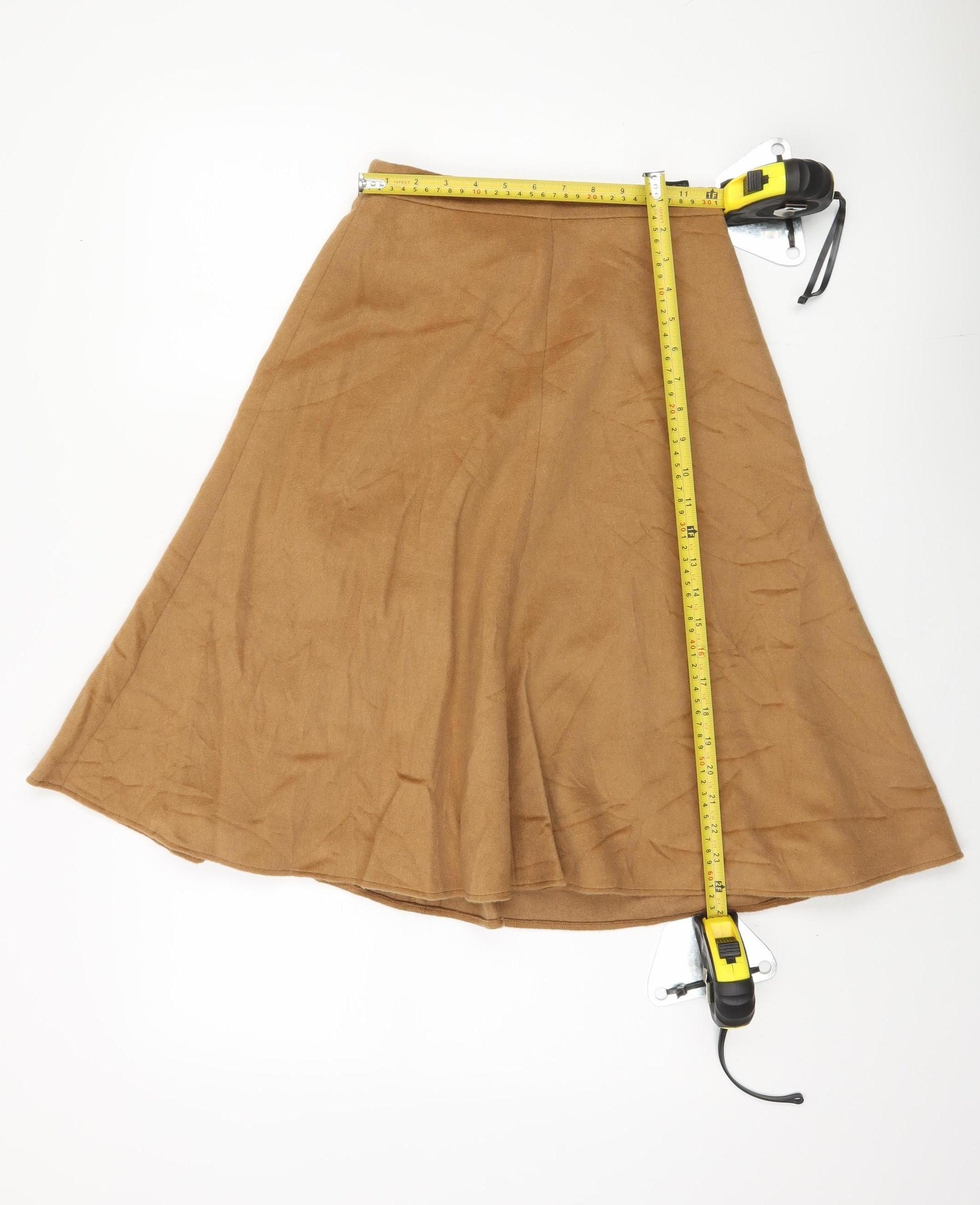 Explore the timeless elegance of this Marks and Spencer midi skirt, crafted from a rich blend of wool, polyester, and other fine fabrics. Designed in an A-line silhouette, this skirt delivers a classic style that remains flattering and versatile for various occasions. The neutral brown hue ensures it pairs effortlessly with a range of tops and accessories, making it a valuable addition to any wardrobe. With a UK size 8 fit, this skirt is perfect for women seeking a blend of comfort and style. The zip closure at the back allows ease of wear while maintaining a sleek appearance. Although slight creasing is visible, this item is in excellent condition, ensuring high quality and durability. Made with care, the material breakdown reveals a thoughtful blend: 23% wool for warmth, alongside polyester, acrylic, and more, offering a soft touch and structured fit. This skirt is also dry clean only, preserving its fabric and shape for longer life. Suitable for any season, this skirt's simplicity allows it to be dressed up or down, whether you're heading to the office or enjoying a casual day out. Pair with a blouse and heels for an elegant look, or choose a cosy knit and flats for laid-back charm. Do not miss out on the opportunity to own this versatile wardrobe staple.