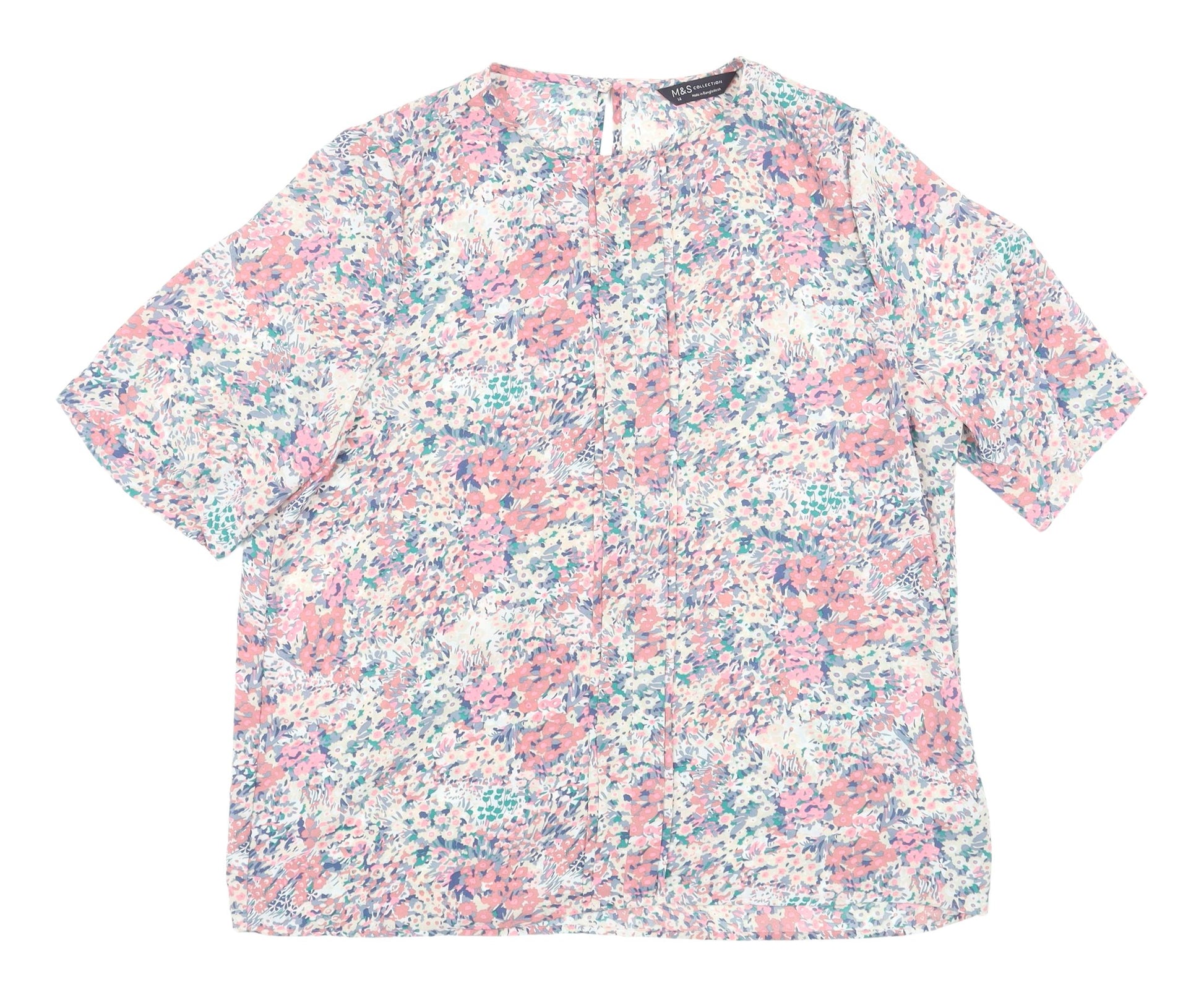 This Marks and Spencer blouse is a stunning addition to your casual wardrobe. Crafted from lightweight, breathable polyester, this floral blouse is perfect for the Spring and Summer seasons. The multicoloured design is bright and cheerful, featuring a visually captivating pattern that adds vibrancy to your outfit. Designed with short sleeves and a classic crew neckline, this blouse offers a regular fit that provides comfort and style for everyday wear. The simple button closure at the back adds convenience and ensures a secure fit. Ideal for casual occasions, this blouse can be easily paired with your favourite jeans or a skirt for a relaxed yet chic look. The easy-care fabric is machine washable, making it a practical choice for your daily fashion needs. Elevate your wardrobe with this stylish floral blouse, perfect for adding a touch of colour to your look!