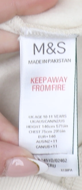 This delightful Marks and Spencer Girls Beige Full Zip Hoodie offers a perfect blend of style, comfort, and practicality for everyday wear. Designed from a cosy cotton and polyester fleece blend, it provides warmth and softness ideal for cooler days. The hoodie features a relaxed regular fit with ribbed cuffs and hem for a snug, secure feel, while the zip-front closure allows for easy dressing and layering. The hood adds an extra layer of comfort and protection, making it a great choice for changing seasons.Eye-catching and fun, this hoodie showcases a beach-inspired graphic print on both the chest and back with the phrase 'Ride the Waves,' creating a laid-back, summery vibe that encourages adventure and positivity. Two front kangaroo-style pockets offer practical storage for small essentials or to keep hands warm, making it both stylish and functional.Machine washable for easy care, this hoodie is ideal for school days, holidays, or relaxing weekends. Its soft, breathable fabric keeps kids comfortable throughout the day, while the neutral beige shade makes it easy to pair with jeans, leggings, or joggers. Perfect for layering over a t-shirt or under a jacket, this piece effortlessly fits into any girl’s casual wardrobe.With its cheerful design and quality construction, this Marks and Spencer hoodie is a wonderful choice for active kids who love comfort with a touch of personality. Whether worn on a seaside trip, for after-school activities, or simply lounging at home, it provides both durability and timeless style that can be enjoyed all season long.