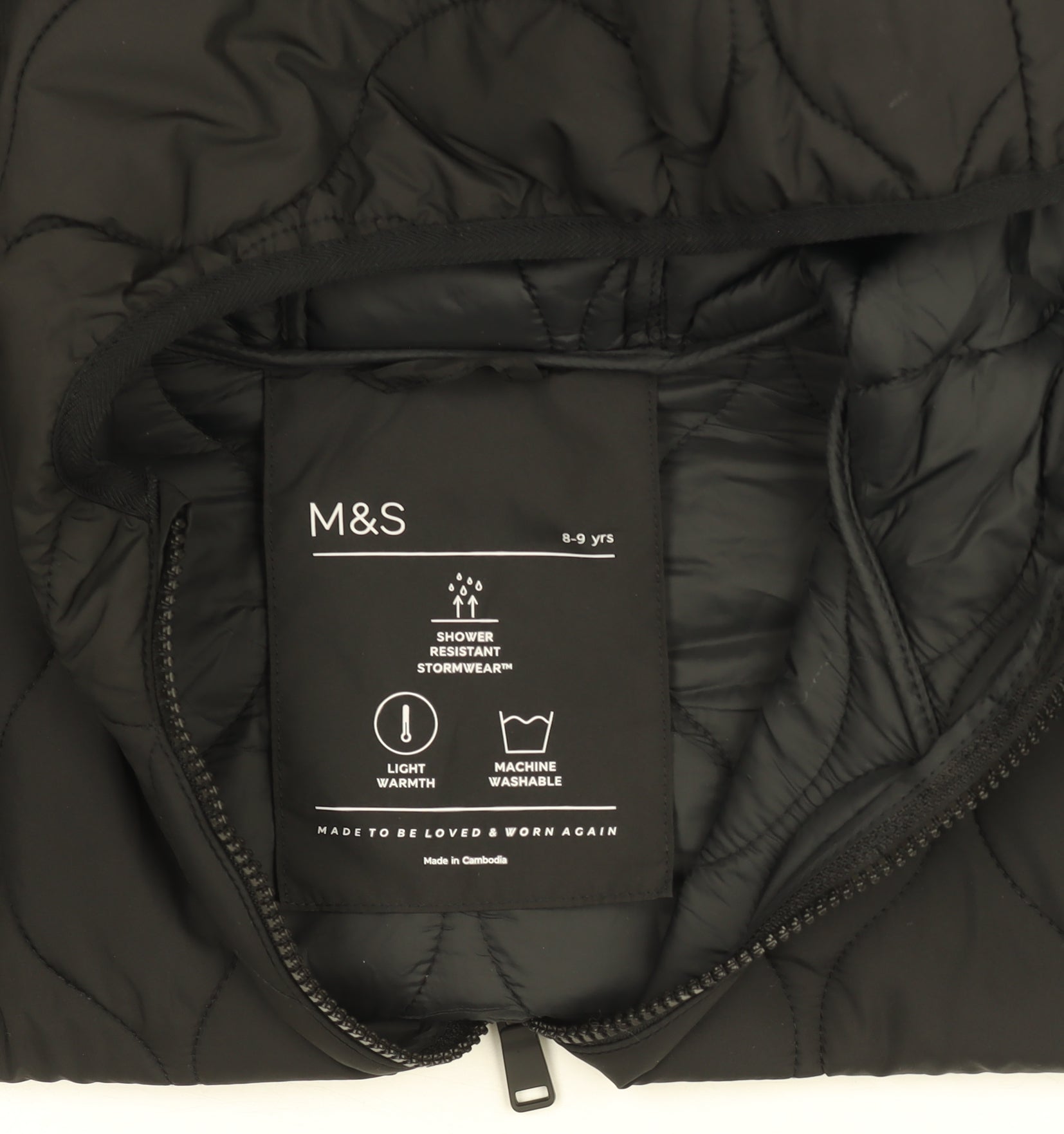 Keep your little one cosy and stylish with this Marks and Spencer Girls Black Hooded Quilted Puffer Jacket in size 8-9 Years. Designed to withstand unpredictable British weather, this jacket features Stormwear™ technology for reliable water resistance, making it ideal for chilly autumn strolls or the brisk winter school run. The lightweight, quilted shell fabricated from 100% polyester ensures comfort and warmth without bulk, while the soft polyester lining adds an extra layer of cosiness. Its full-zip front closure and practical zipped pockets blend practicality with everyday style. The hood offers additional protection on windy or drizzly days, ensuring your child stays snug and dry. This classic black puffer jacket boasts a regular fit, making it easy to layer over jumpers or uniforms, while the wrinkle-resistant, machine-washable fabric keeps it looking fresh with minimal effort. Perfect for casual outings, school, or weekend adventures, it’s versatile, easy to pair with any outfit, and durable enough for all the fun that comes with childhood activity. With its thoughtful details, quilted texture accents, and Marks and Spencer’s trusted quality, this piece balances function and fashion effortlessly. In excellent pre-loved condition, it shows no visible signs of wear and has been carefully maintained—ready for many more wears. Ideal for parents seeking reliability, quality, and practicality, this jacket brings warmth, durability, and timeless appeal to any girl’s outerwear collection. An essential for the colder months, it’s the perfect outerwear piece to keep her comfortable whatever the weather.