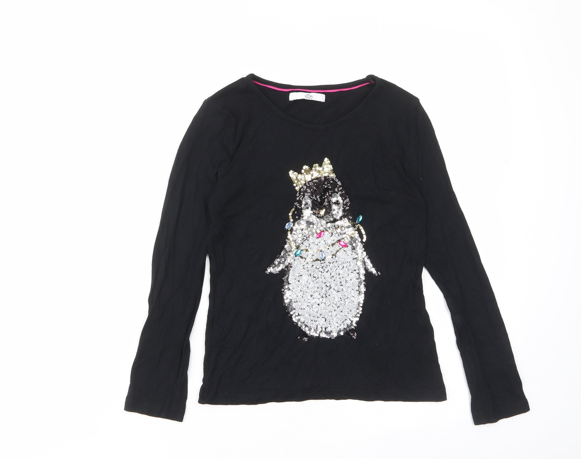 Girls Black Viscose Basic T-Shirt Size 9-10 Years Crew Neck Pullover - Penguin, Sequins