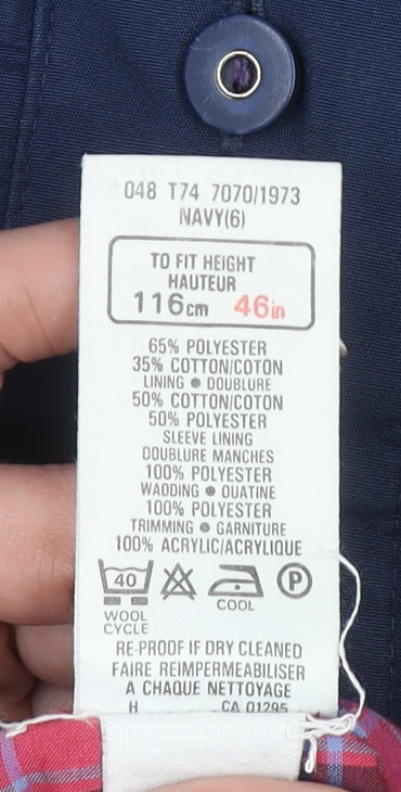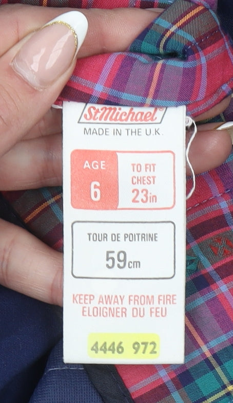 Add a touch of timeless charm to her outerwear collection with this delightful Marks and Spencer Girls Hooded Rain Coat. Crafted under the St Michael label, this classic navy-blue coat offers reliable style and comfort. Designed with a softly structured silhouette, it features a gently gathered waist for a traditionally pretty look while allowing ease of movement. The coat’s durable outer shell is made from a comfortable blend of polyester and cotton, offering light water resistance to keep her dry during those drizzly autumn and winter days.Inside, a warm cotton and polyester lining in a vibrant tartan pattern adds extra comfort and a splash of colour. A hood provides protection from wind and showers, while the button-down closure ensures a snug and secure fit. Practical side pockets are perfect for keeping little treasures close at hand. The long sleeves, complete with embroidered cuffs, deliver both warmth and a hint of vintage charm.Perfect for everyday wear, school commutes, or family outings, this versatile coat is both practical and stylish. As a true Marks and Spencer vintage piece, it retains the brand’s renowned quality and attention to detail. This coat fits a child aged 6 years, with a chest size of approximately 59 cm (23 inches) and height guidance up to 116 cm (46 inches).Ideal for casual wear in cooler seasons, this beautiful coat combines functional design with a classic aesthetic, making it a piece that never goes out of style. In new condition with original tags attached, this coat offers exceptional value and enduring appeal for any young wardrobe. Treat her to comfort, warmth, and heritage-inspired elegance with this lovely hooded rain coat from Marks and Spencer.