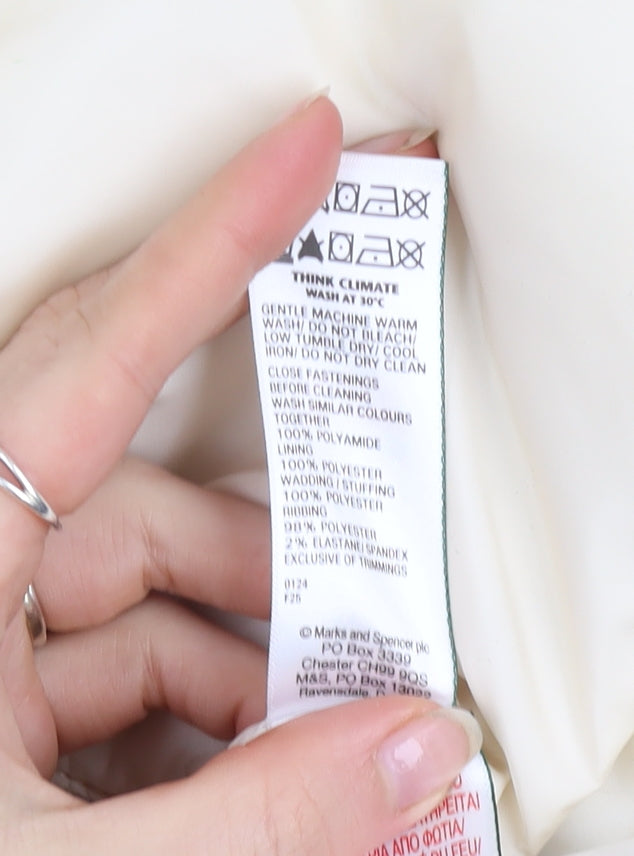 Keep your little one warm and comfortable in the colder months with this lovely ivory puffer coat from Marks and Spencer. Designed especially for girls aged 9-10 years, this practical winter coat combines everyday style with reliable functionality. The outer shell is crafted from durable polyamide fabric, which features the brand’s Stormwear™ technology for water resistance, helping to keep light showers at bay. Its cosy polyester padding ensures medium warmth without feeling bulky, making it ideal for both autumn and winter wear. The coat’s soft polyester lining enhances comfort, while the ribbed cuffs made from polyester and elastane help lock in heat. Featuring a functional hood, zip and snap fastenings, and two front flap pockets, this quilted design is perfect for school days, casual outings, or weekend adventures. The simple ivory colour makes it easy to pair with any outfit, while the longline silhouette offers extra coverage against chilly winds. Although this coat is in very good condition, there is a faint mark near the front placket, which does not detract from its overall excellent appearance. It shows gentle signs of previous wear but remains a high-quality, durable outerwear choice ready for its next owner. Machine washable and built to last, this warm, padded coat embodies Marks and Spencer’s signature blend of comfort and practicality. A must-have staple that ensures kids stay snug and stylish whatever the weather.