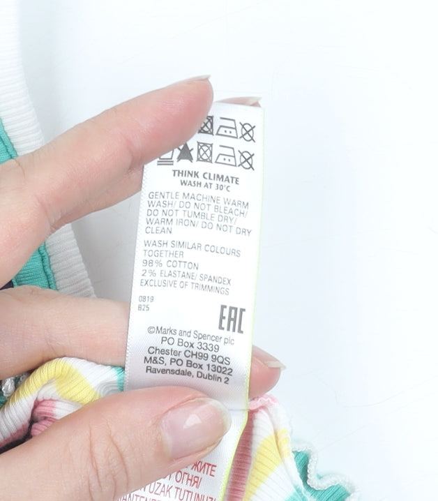 Brighten up your little one’s wardrobe with this delightful Marks and Spencer Girls Multicoloured Striped Short Sleeve Cotton T-Shirt, designed for ages 4 to 5 years. Crafted from a soft and breathable Jersey fabric, this cheerful top delivers everyday comfort with a playful twist. The colourful stripe pattern in hues of pink, yellow, green, blue and white adds a fun pop of colour ideal for any time of year. The fabric is composed of 98% cotton with 2% elastane, giving it a gentle stretch that allows for unrestricted movement whether at school, on playdates, or during relaxed days at home. The crew neckline offers a classic fit, while the short sleeves and lightweight construction keep it perfect for layering or wearing alone on warmer days. The hemline features a subtle lettuce trim, adding a sweet and stylish finish to this versatile everyday tee. This Marks and Spencer T-shirt is machine washable, ensuring practical care for busy parents. Its durable cotton blend holds shape and colour well, meaning it will last through numerous washes and wears. The overall condition is excellent, with the shirt showing only light previous use and no visible flaws. It does not retain its original sales tags, but it remains in beautiful shape ready to wear. Perfect for the spring and summer seasons, and adaptable for cooler months under cardigans or jumpers, this top blends practicality with charm. Bring a touch of rainbow joy and quality craftsmanship to your child's everyday collection with this lovely Marks and Spencer striped tee—a piece that balances classic comfort and cheerful design effortlessly.