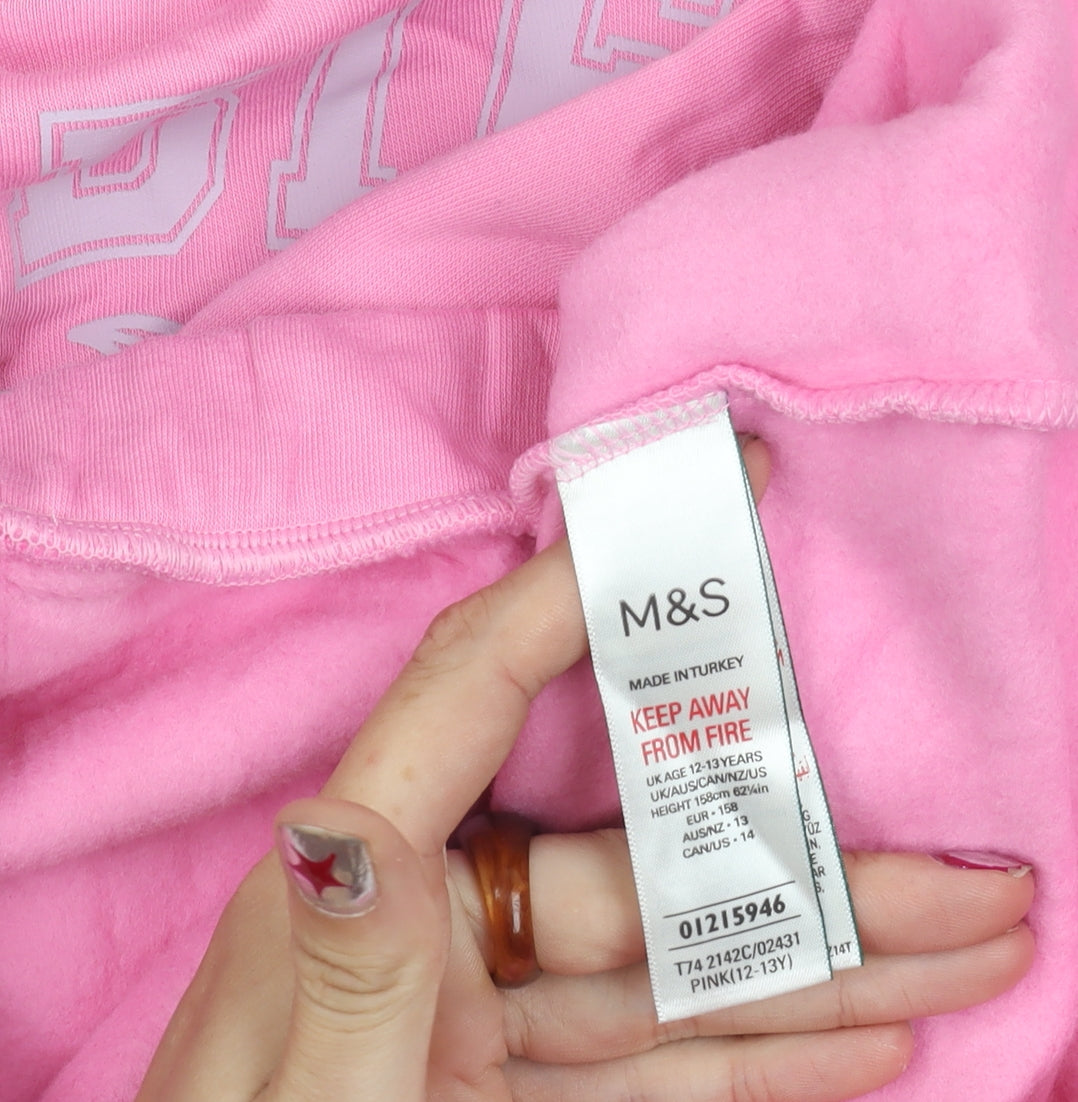 Bring a touch of fun and youthful style to your child's wardrobe with this Marks and Spencer Barbie pullover hoodie, designed especially for girls aged 12-13 years. Crafted in a vibrant pink hue, this hoodie showcases a bold Barbie logo graphic print across the chest, adding a pop of playful character appeal. Officially licensed, the design celebrates Barbie with a stylish nod to its iconic branding, making it a fantastic option for Barbie fans. Made from a soft blend of cotton and polyester, the hoodie offers comfort and breathability whilst maintaining a durable structure suitable for everyday wear. The main body fabric comprises 85% cotton and 15% polyester, while the ribbing includes added elastane for stretch and fit retention. Its cosy jersey fabric ensures warmth during cooler months, making it ideal for autumn, winter, or spring layering.The classic pullover style features long sleeves, a crew neckline, and a handy front kangaroo pocket – perfect for keeping hands warm or for stashing small essentials. Designed with a hood for added practicality and comfort, this hoodie is versatile enough for casual days out, lounging at home, or layering over an outfit for a relaxed streetwear look. Although in good pre-loved condition, please note there is some visible staining on one sleeve cuff, reflecting minor wear but leaving the hoodie in perfectly wearable condition. While it does not come with original sales tags, it remains a stylish, well-made garment ideal for everyday use.This Marks and Spencer Barbie hoodie is a charming and practical choice that combines comfort, casual fashion, and brand heritage. A great piece for school, weekends, or casual outings, it’s a must-have for any young Barbie enthusiast’s wardrobe. At an affordable price, it delivers value without compromising style or quality.