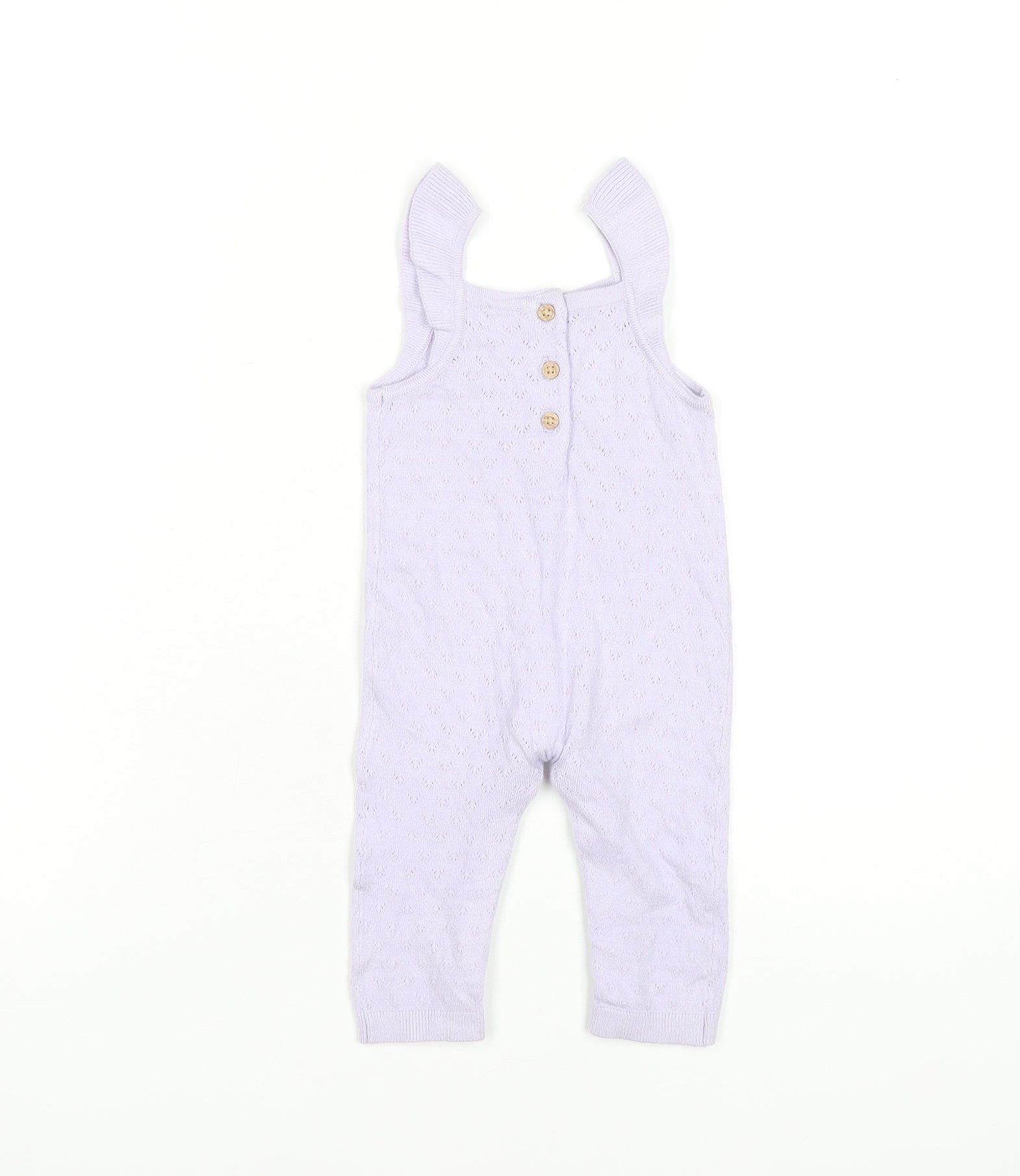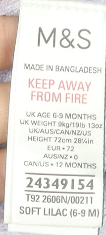This darling Marks and Spencer baby girls’ knit dungaree offers both comfort and style, making it a perfect choice for your little one. Crafted in a soft, breathable blend of viscose, polyester, and polyamide, the lightweight knit provides gentle stretch while maintaining durability. Designed in a soft lilac purple shade, this piece is both charming and versatile, easy to layer for varying seasons. The sleeveless cut and lightweight knit construction make it ideal for spring and summer wear, while the ruffled straps add a delicate touch of extra style. A square neckline offers a neat shape, while the three wooden-style button closure at the back adds practicality and character. The subtle eyelet-style knit pattern gives it a hint of texture without being overwhelming, keeping the overall aesthetic classic and elegant. Sized at 6–9 months, this piece is suitable for babies up to 9kg/19lbs and 72cm in height. Perfect for casual everyday wear, this dungaree can easily be layered over a bodysuit or paired with a light cardigan for cooler days. With its pastel hue and versatile styling options, it is suited for everything from playdates to family gatherings. The garment has been checked carefully and is in excellent condition with no visible defects, though it no longer retains its original sales tags. This makes it an affordable yet high-quality choice for parents looking for stylish baby clothing without compromising on quality. Marks and Spencer are well-known for their focus on quality fabrics and practical yet fashionable kidswear, making this dungaree a brilliant wardrobe addition. Easy to care for, the garment is machine washable at 30ºC, ensuring convenience for busy parents. Overall, this is a stylish yet practical piece that combines comfort, quality, and timeless charm, making it the ideal everyday outfit option for your baby girl.
