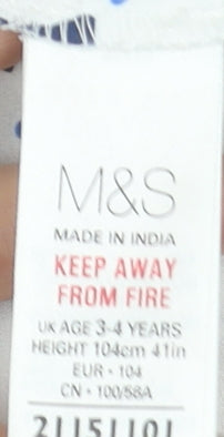 Delight your little one with this adorable Marks and Spencer girls’ blouse, designed for everyday comfort and charm. Crafted from 100% polyester, the lightweight and breathable material ensures lasting wear and easy maintenance – perfect for active young girls. The blouse features a playful multi-dog print in shades of navy, red, and blue against a crisp white background, giving it a lively and cheerful appeal. The contrast Peter Pan collar and button placket add a classic touch, while the back button closure ensures a secure and comfortable fit. Designed for ages 3–4 years (height approximately 104 cm), it allows plenty of room for movement whether for playtime, parties, or casual outings. With its short sleeves and soft fabric, this blouse is ideal for the spring and summer seasons but can also be layered under sweaters or cardigans during cooler months. The eye-catching print complements any wardrobe, making it a great choice for both everyday wear and special occasions. Marks and Spencer’s attention to quality and detail guarantees durability and resistance to wrinkles, maintaining a polished appearance with minimal effort. Easy-care and machine washable, this blouse is a practical addition for parents looking for both style and convenience. Condition is excellent, showing no visible signs of wear, and it retains its bright colours and crisp structure. Perfect for adding a dash of classic British charm to any outfit, this item mixes practicality and playfulness effortlessly. Pair it with jeans, skirts, or shorts for a timeless and cute look that’s sure to bring joy to any young fashionista.