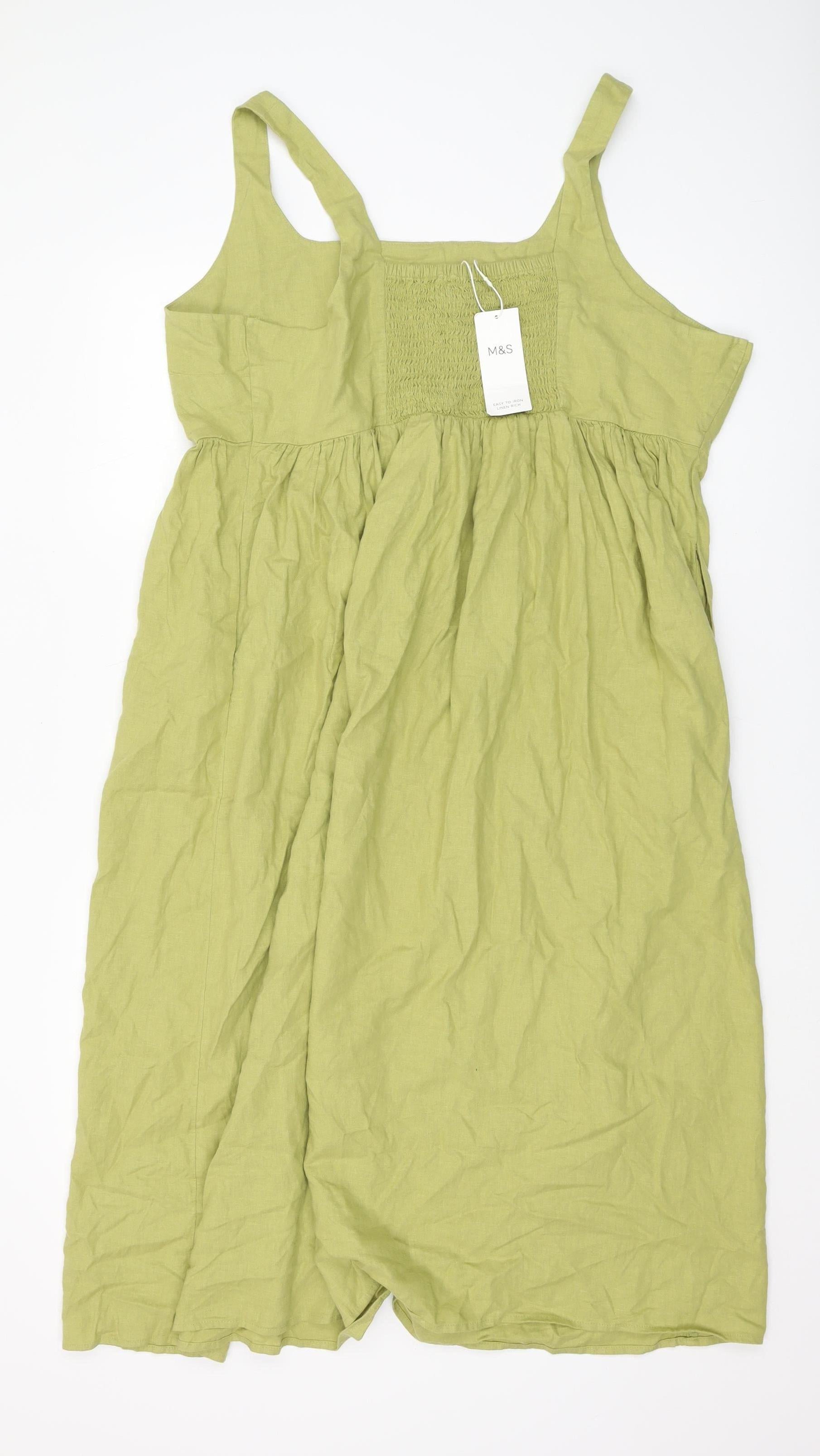 Discover effortless style with this Marks and Spencer Green Sleeveless Dress, a perfect addition to your spring and summer wardrobe. Crafted for women who appreciate timeless elegance, this dress features a modern square neckline and strappy sleeves, adding a touch of sophistication to any look. The Linen and Viscose blend fabric ensures a breathable and lightweight feel, perfect for warm days. Designed with practicality in mind, it offers a comfortable pullover closure and machine washable convenience, making it easy to maintain. The smocked detailing on the back provides a subtle accent, enhancing the dress's fit and style. Available in size 20, this dress offers a comfortable fit for regular sizing. Its clean, minimal design focuses on quality and simplicity, suitable for various occasions, whether you're dressing up for a casual day out or keeping it chic at a garden party. Embrace versatility with a dress that offers both comfort and style.