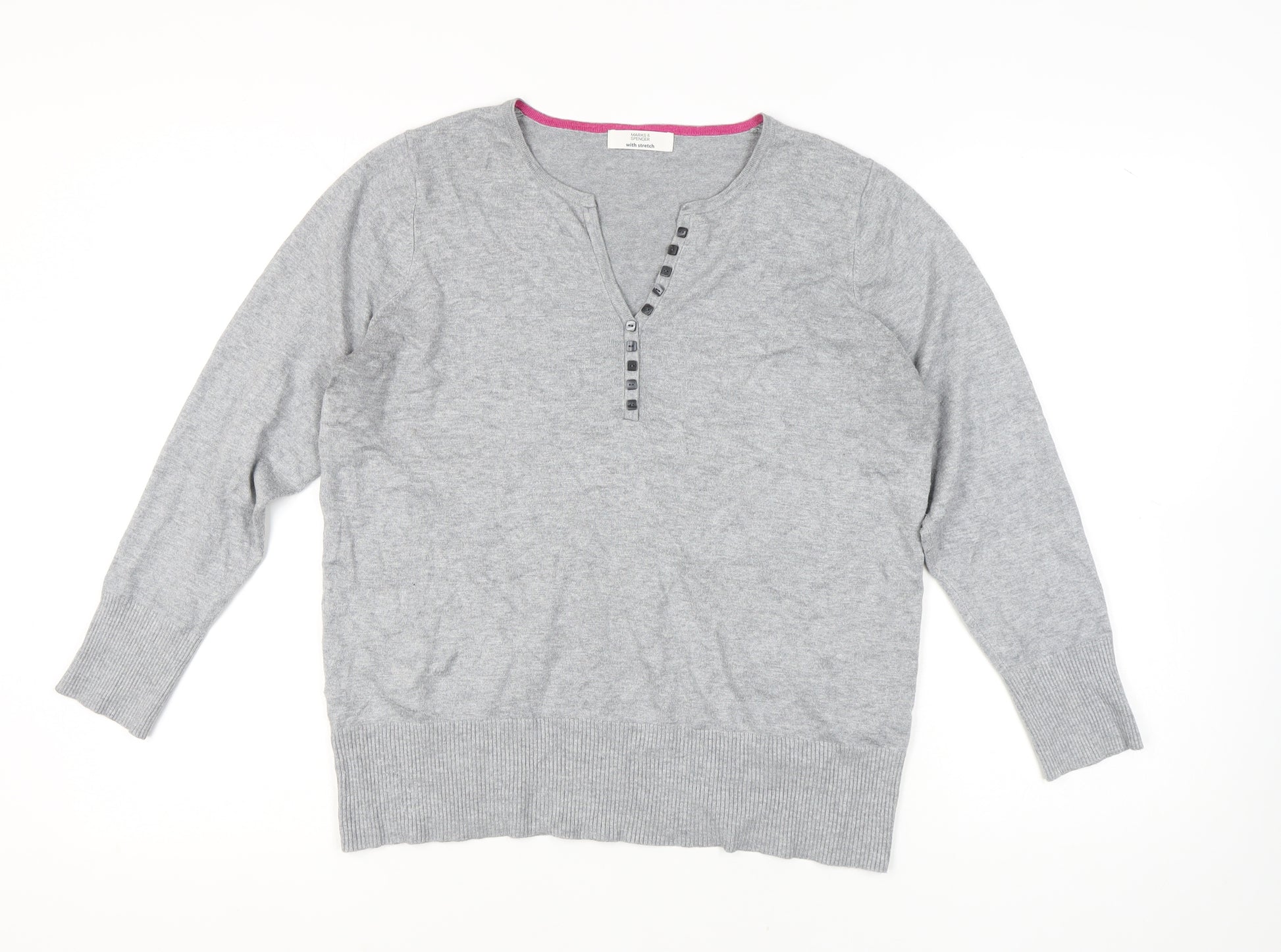 Enjoy the understated elegance of this Marks and Spencer women's jumper in a versatile grey shade. It's crafted with a chic Henley style that features decorative button accents and long sleeves to keep you cosy in cooler weather. The lightweight material makes it perfect for layering, while its blend of soft viscose and durable polyamide ensures comfort and longevity. With a no-pattern design, this jumper is a beautiful addition to any wardrobe, offering both style and practicality. Ideal for everyday wear, this piece promises style in comfort for any casual outing.