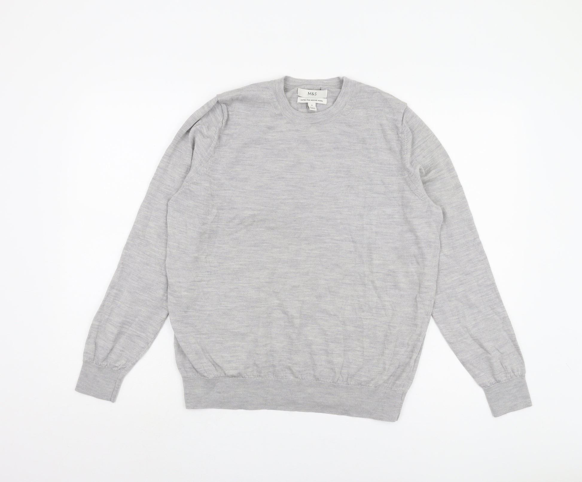 Discover comfort and elegance with this Marks and Spencer Women's Jumper, crafted from luxurious extra-fine Merino wool. This pullover, in a versatile grey hue, is perfect for adding a touch of sophistication to your autumn and winter wardrobe. Designed with a classic crew neckline and long sleeves, this jumper offers a regular fit that's both timeless and flattering. Its knitted fabric provides a cozy feel, making it ideal for casual occasions and layering during colder months. Please note the minor stain on the back, though it remains in good condition overall. This item is perfect for those who appreciate quality materials from trusted brands, offering a touch of class and warmth. Priced attractively at £12.00, it's a fantastic addition to any stylish wardrobe. Don't miss the opportunity to own this versatile piece, perfect for pairing with your favorite jeans or a classy skirt for a complete look.