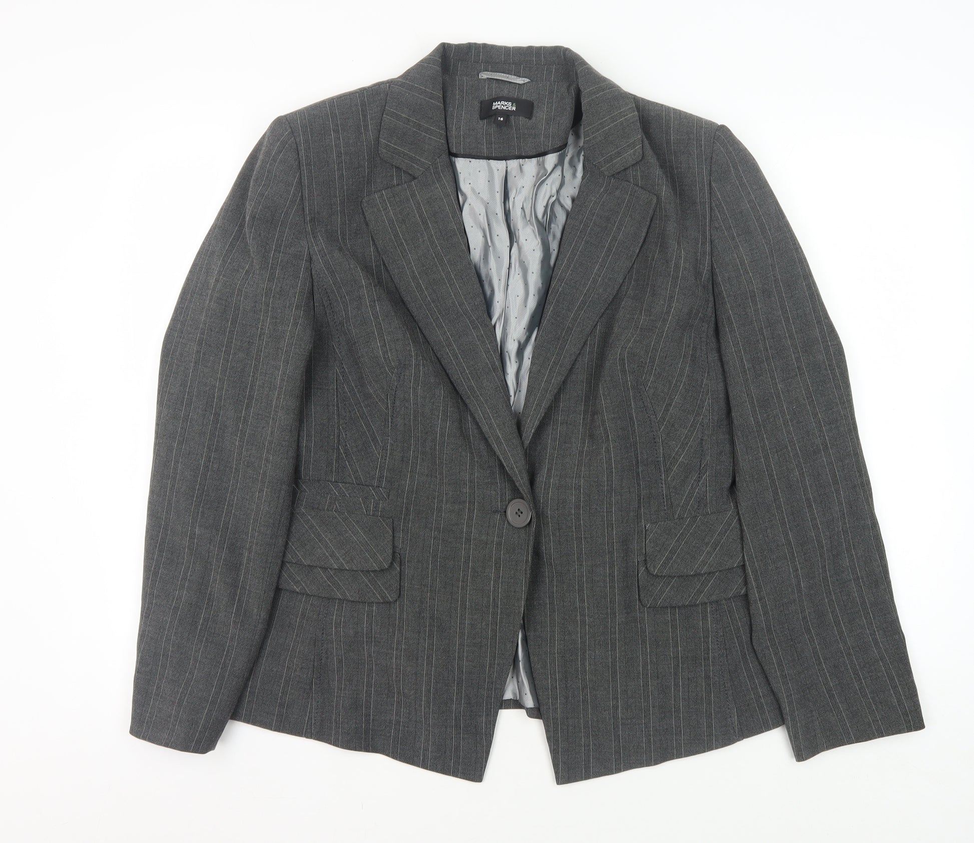 This grey pinstripe blazer from Marks and Spencer is a versatile addition to any wardrobe, perfect for business or workwear occasions. Crafted from a blend of polyester, viscose, and elastane, this jacket provides a comfortable classic fit with professional appeal. The single-breasted, one-button closure and notch lapel style give it a timeless look. Although in excellent condition with minor signs of previous wear, it's machine washable and designed to withstand the demands of a busy schedule. Ideal for spring and autumn, this blazer pairs easily with trousers or skirts, offering endless style possibilities. Elevate your office attire with this high-quality jacket that combines practicality with sophisticated style.