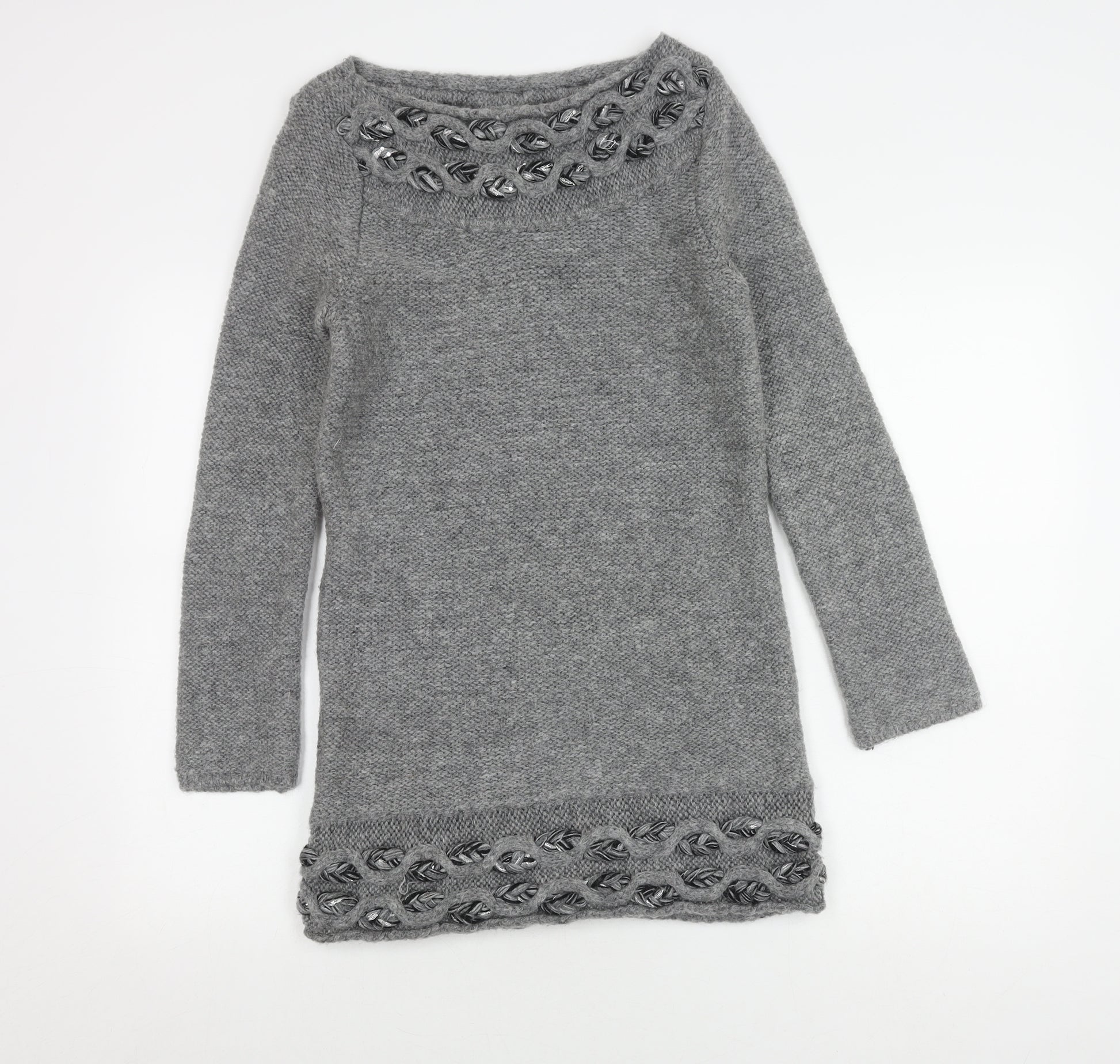 Elevate your wardrobe with this exquisite grey jumper from Marks and Spencer, perfect for adding a touch of elegance to your casual wear. Crafted to perfection, it is designed with a boat neck neckline and long sleeves, striking an ideal balance between style and comfort. This women's jumper, in a size small, features subtle embroidered accents that provide a chic and refined appearance, making it a versatile piece suitable for various occasions. The jumper is made from a quality blend of materials including acrylic, polyester, polyamide, and wool, ensuring warmth and durability. Its timeless grey colour offers a neutral base that complements any outfit, while the no-pattern knit enhances its classic appeal. With no visible defects, it is in excellent condition, ready for the next owner to make it a staple in their collection. Whether you're heading out for a day of shopping, a casual lunch, or simply relaxing at home, this jumper promises to keep you cozy and stylish all day long.