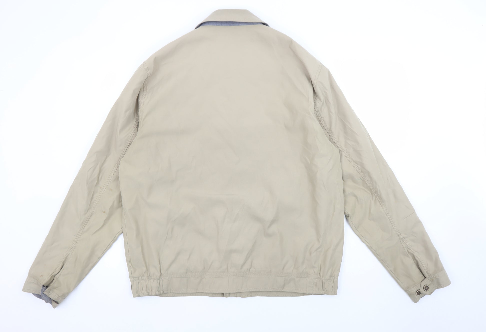 Upgrade your casual wardrobe with this Marks and Spencer Men’s beige full zip jacket, a timeless and versatile piece designed for everyday comfort and style. Made from durable polyester, this lightweight jacket is perfect for spring and autumn wear, offering breathability and a relaxed fit. It features a classic point collar, secure zip fastening, and twin zipped pockets for practicality and convenience. The stone-beige tone makes it easy to pair with jeans, chinos, or casual trousers for an effortlessly smart look.The jacket is fully lined with soft polyester for added comfort, and it’s machine washable, ensuring it’s easy to care for and maintain. Small details such as button cuffs and subtle stitching add refinement without compromising its minimalist appeal. Perfect for layering over shirts or jumpers during cooler days, this jacket combines functionality with classic British style. The collared neckline and clean lines make it ideal for both casual and semi-smart occasions.This Marks and Spencer design provides a practical and stylish outerwear option for modern men who appreciate quality craftsmanship and understated fashion. Despite minor surface marks on the front pocket area, the garment remains in good used condition, showing minimal wear overall. Its durable polyester shell resists wrinkles and light weather, making it great for transitional seasons.Whether you’re heading out for a walk, commuting, or meeting friends, this versatile jacket will complement your daily look with ease and sophistication. Its relaxed fit ensures comfort without sacrificing structure, making it a reliable staple in any wardrobe. Discover effortless everyday style with this classic piece from Marks and Spencer.