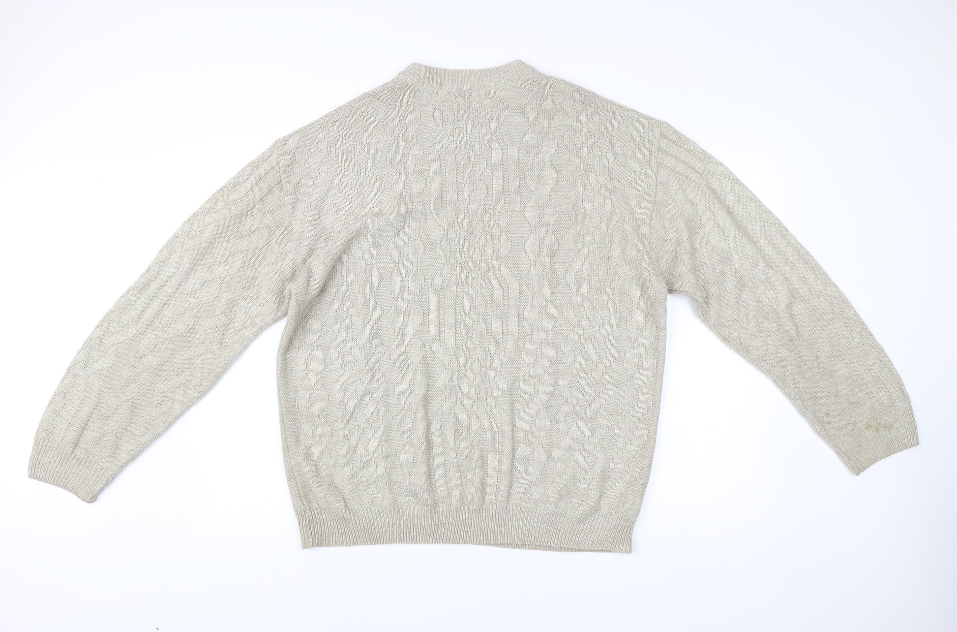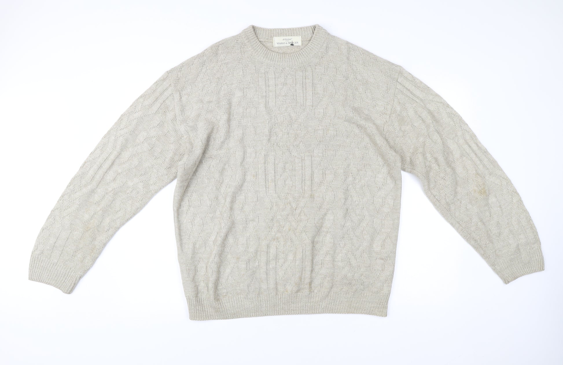 This vintage Marks and Spencer St Michael men’s jumper is a timeless piece that blends classic comfort with enduring style. Designed in an elegant beige tone, this jumper is versatile and suitable for a variety of outfits and occasions. Crafted in the UK, it represents the fine quality and reliable heritage of the St Michael range from Marks and Spencer, making it an excellent choice for those who appreciate both tradition and functionality. Made from 100% acrylic, this pullover jumper is lightweight, durable, and easy to maintain as it is machine washable. The knit fabric ensures breathability, while the cable-knit design adds a textured, classic finish that elevates its visual appeal. The jumper comes in a size Large, suitable for a chest 41–43 inches (104–109cm), with a regular fit that offers comfort without compromising on style. Its crew neckline and long sleeves provide warmth, making it perfect for layering during the autumn and winter seasons. Ideal for casual wear, this piece pairs easily with jeans, chinos, or trousers, making it suitable for everyday outings, weekend gatherings, or relaxed evenings indoors. With its vintage appeal, this jumper embodies a timeless, classic theme that stands out while still being versatile enough for modern wardrobes. While this jumper shows some signs of previous wear with light stains on the sleeve and body, it remains in good wearable condition, offering excellent value for vintage fashion enthusiasts. Its quality construction and iconic design mean this jumper will remain a dependable and stylish addition to any wardrobe for years to come. Whether you're collecting vintage Marks and Spencer pieces or simply looking for a practical and stylish knit jumper, this beige cable-knit is a standout option. Affordable, comfortable, and effortlessly stylish, this jumper delivers that well-loved, vintage charm that never goes out of fashion.