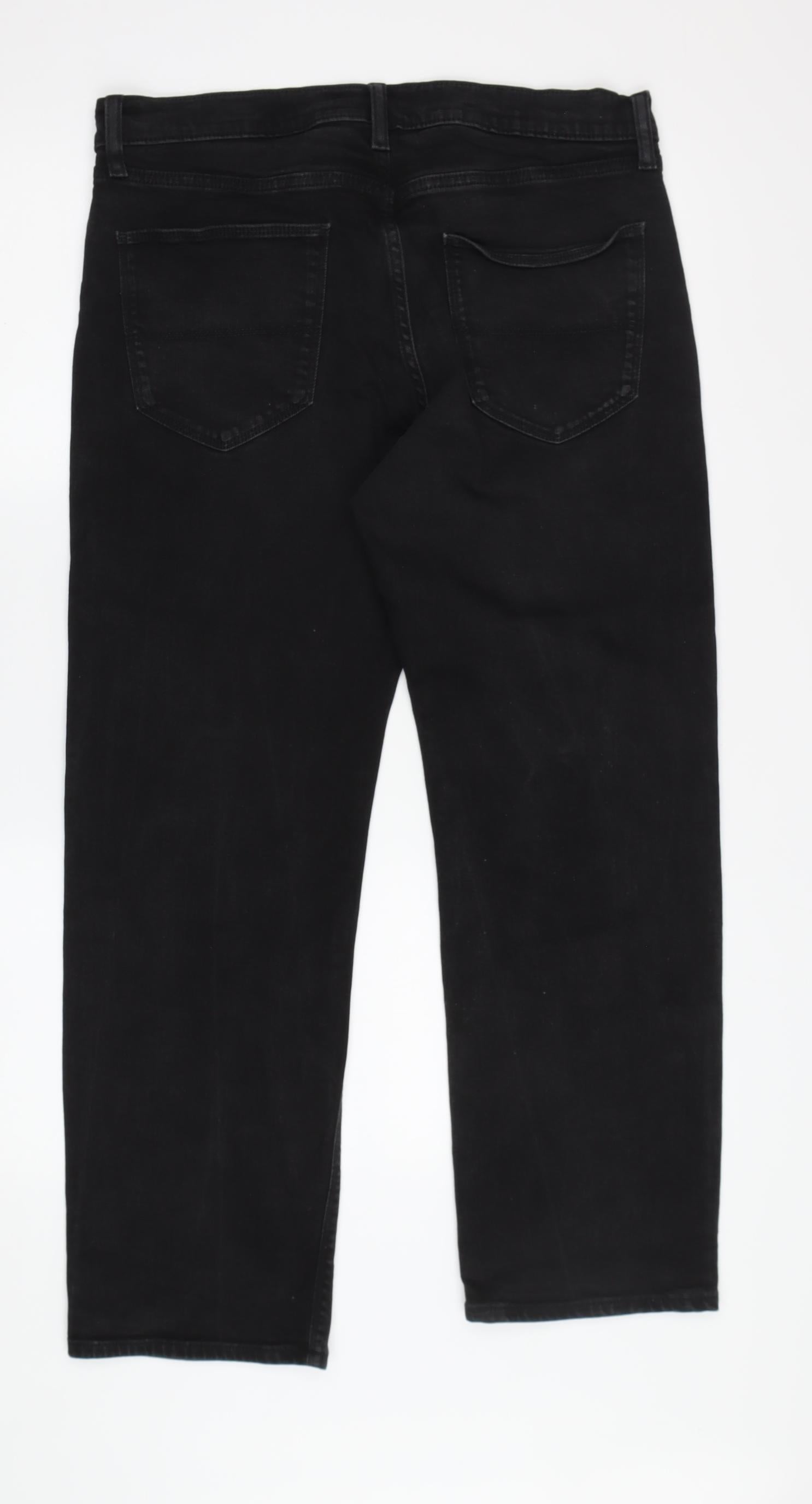 Upgrade your wardrobe with these classic black straight jeans from Marks and Spencer, designed for comfort and style. Crafted from a durable denim blend featuring 98% cotton and a hint of elastodiene for added stretch, these jeans offer a reliable fit and superb comfort for everyday wear. The regular fit and mid-rise ensure a balanced silhouette, perfect for pairing with a casual shirt or a smart jumper. The 5-pocket design adds functionality, making these jeans both practical and versatile. The dark wash elevates the look, making these jeans suitable for any autumn or winter outing, whether you're heading to the office or out with friends. The button and zip closure provide secure fastening, while the classic black colour further enhances their adaptability across various styles and occasions. Machine washable and easy to care for, these jeans are an essential addition to any modern man's wardrobe. With no visible wear, these jeans are in excellent condition, promising both style and quality at an affordable price.