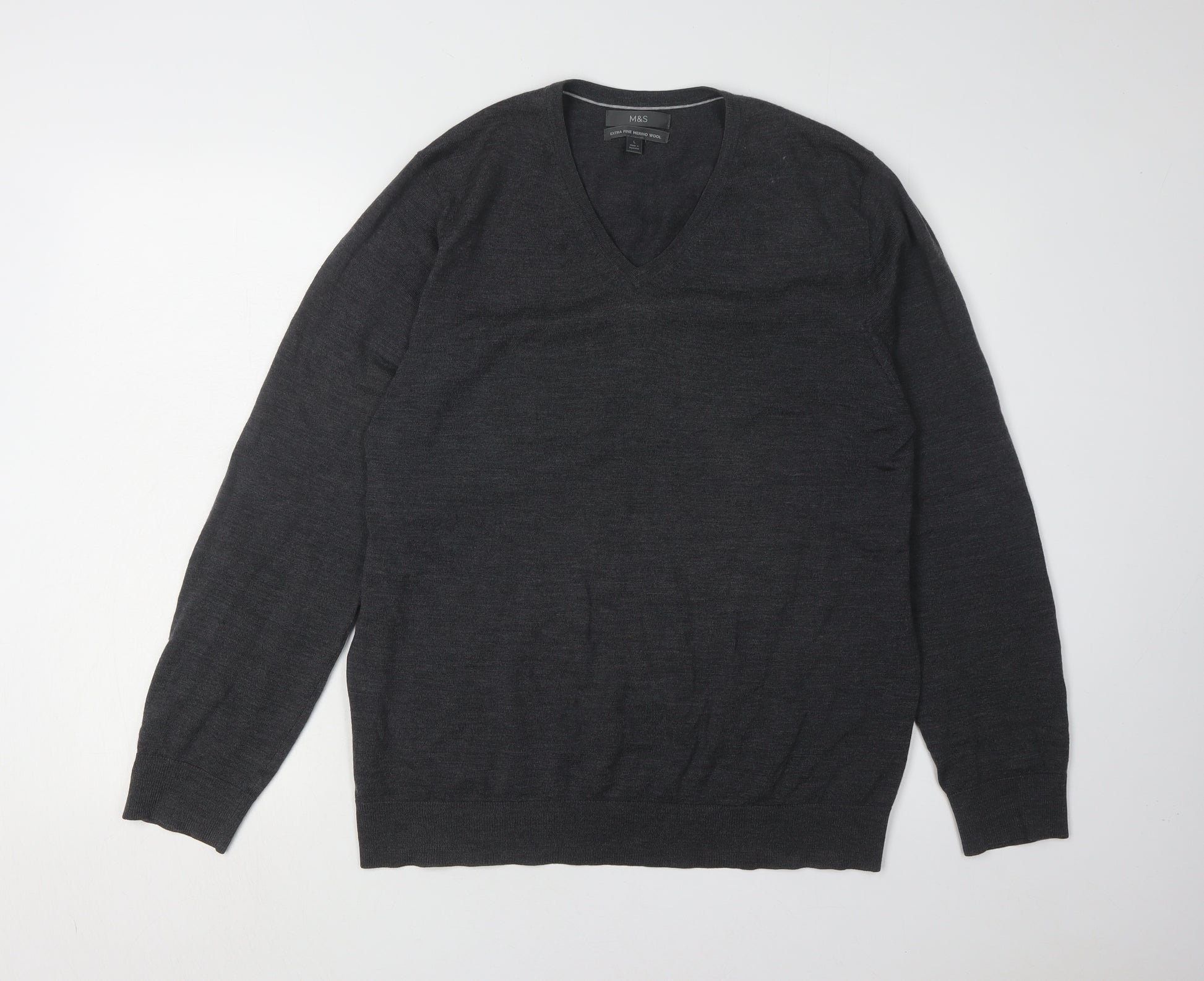 Elevate your casual wardrobe with this stylish Marks and Spencer men's black jumper. Crafted from premium extra fine merino wool, this pullover promises both warmth and elegance. Designed with a classic V-neckline and long sleeves, it provides a timeless look that can seamlessly transition from casual day wear to a relaxed evening style. The jumper, available in size large, is tailored to offer a comfortable regular fit. Made from high-quality knit fabric, it ensures breathability and comfort throughout all seasons, making it a versatile addition to your collection. Whether you're heading to a casual outing or enjoying a relaxed day at home, this black jumper adds a touch of sophistication to any ensemble. Easy to pair with your favourite jeans or trousers, it suits various occasions, ensuring you stay stylish and comfortable. The minimalist design and solid black colour are perfect for layering under jackets or wearing alone for a sleek, modern look. Experience the luxury of merino wool and invest in a piece that combines both form and function effortlessly. Don't miss out on this must-have essential.