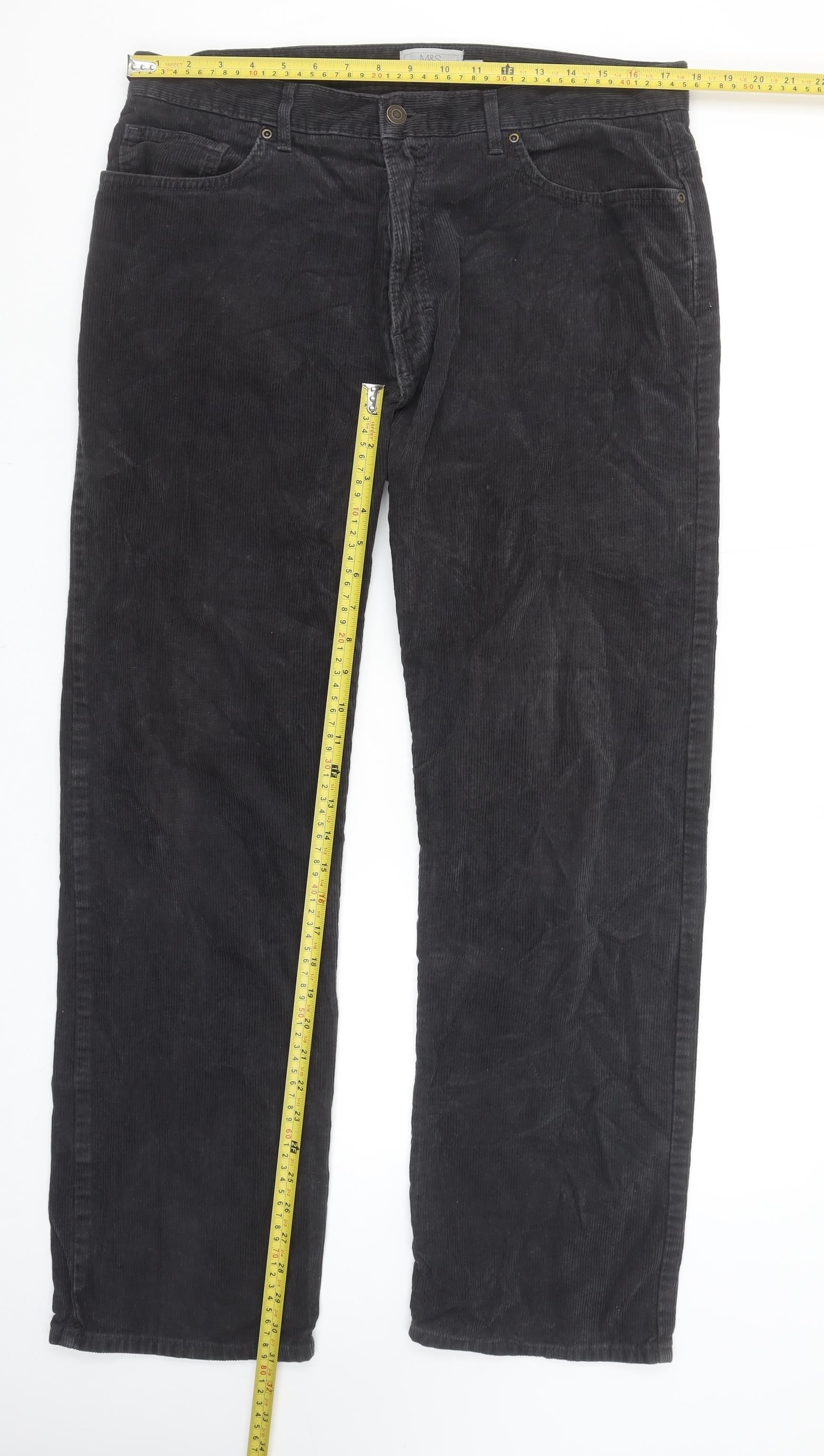 These stylish men's corduroy trousers from Marks and Spencer combine classic comfort with versatile design, perfect for smart-casual dressing throughout the cooler months. Crafted in soft, durable cotton-rich fabric with a touch of elastane, they deliver both comfort and flexibility, ensuring a flattering and comfortable fit all day long. The classic five-pocket design and button-and-zip fastening blend traditional tailored detail with relaxed modern practicality. Designed in a timeless dark grey tone, these trousers are ideal for pairing with shirts, knits, or casual tops, easily transitioning from weekend wear to more polished occasions. The regular fit ensures ease of movement without compromising style, with a straight leg for a neat, unfussy profile. The corduroy fabric offers subtle texture and warmth, making them ideal for autumn and winter seasons. Waist size 36 inches and inside leg 31 inches provide a great fit for the average build. Machine washable and easy to care for, these trousers are a reliable wardrobe staple suitable for everyday wear, business casual outfits, or relaxed social gatherings. In excellent pre-owned condition with only minimal signs of gentle wear, they remain a high-quality option from a trusted British brand. Whether you're dressing for a smart office look or a laid-back weekend ensemble, these Marks and Spencer corduroy trousers offer a versatile foundation piece with a refined, timeless appeal. A must-have for any man seeking comfort, warmth, and effortless style in one dependable pair of trousers.