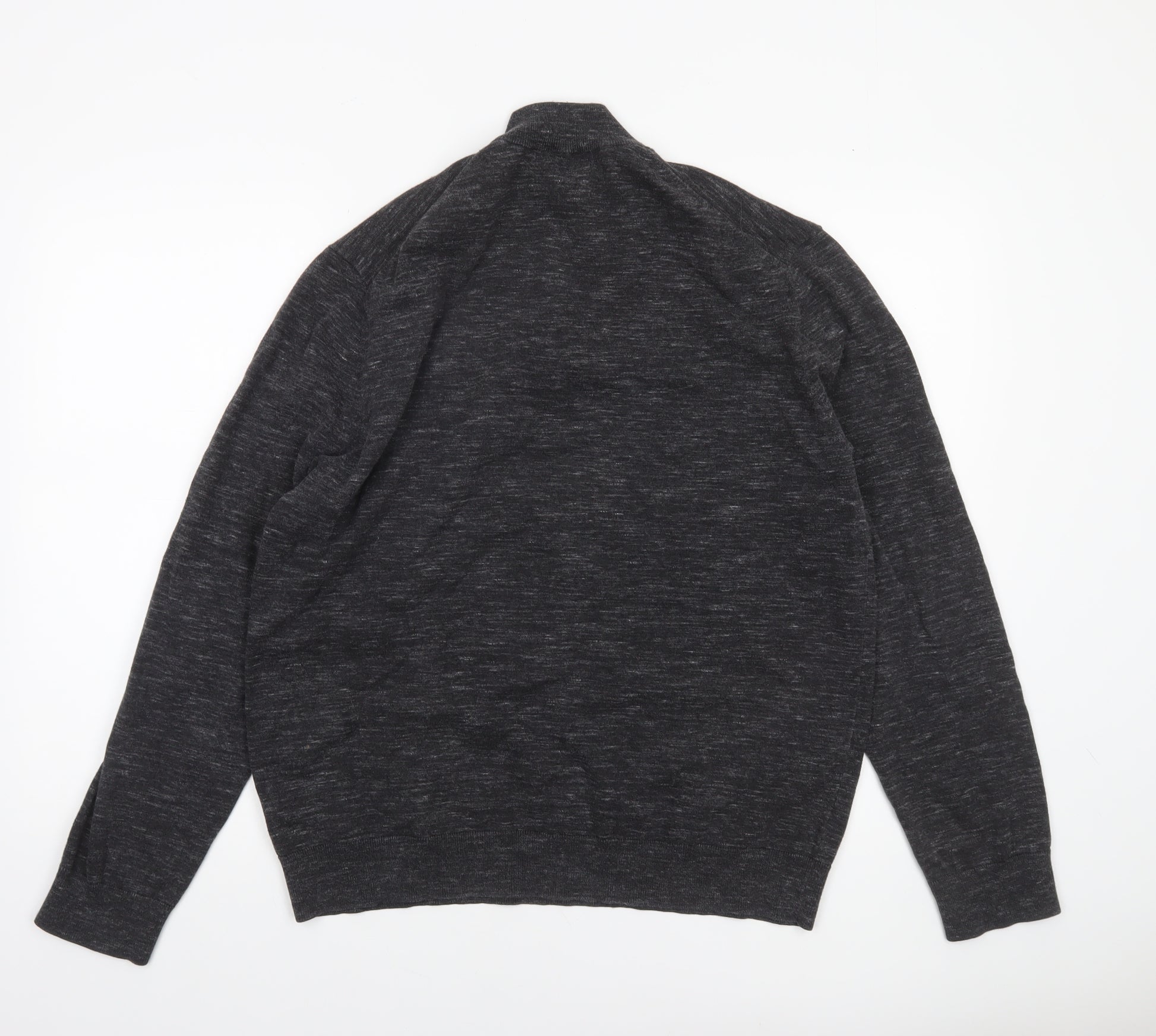Stay effortlessly stylish and comfortable with this Marks and Spencer men’s jumper in size XL. Designed in a sleek dark grey tone, this piece offers a refined yet versatile look that’s perfect for colder months and relaxed outings alike. Made from a soft cotton-rich fabric blend, consisting of 85% cotton and 15% polyamide, this jumper provides superior warmth, breathability, and a comfortable feel against the skin. The durable knit construction ensures a snug fit while maintaining flexibility and easy movement. Featuring a classic 1/4 zip fastening and high neck design, it delivers an ideal balance between casual comfort and smart functionality. The tight-knit texture enhances warmth retention, making it an excellent choice for layering during autumn and winter. The subtle zip accent adds a hint of sophistication, allowing you to adapt your look easily from casual weekends to more polished ensembles. Ribbed cuffs and hem complete the design, offering a neat finish that keeps the fit secure. This Marks and Spencer jumper is machine washable, ensuring easy care and lasting quality. Its simple, timeless design means it pairs beautifully with jeans, chinos, or tailored trousers, giving you endless outfit possibilities. Whether you’re heading out for a walk, attending a casual meeting, or relaxing at home, this piece promises enduring comfort and understated elegance. In excellent pre-owned condition with minimal signs of wear and no visible flaws, this jumper retains its quality and style. Experience dependable craftsmanship and everyday warmth with this essential Marks and Spencer cotton-rich jumper — a wardrobe staple for any modern gentleman who values comfort, quality, and effortlessly versatile fashion.