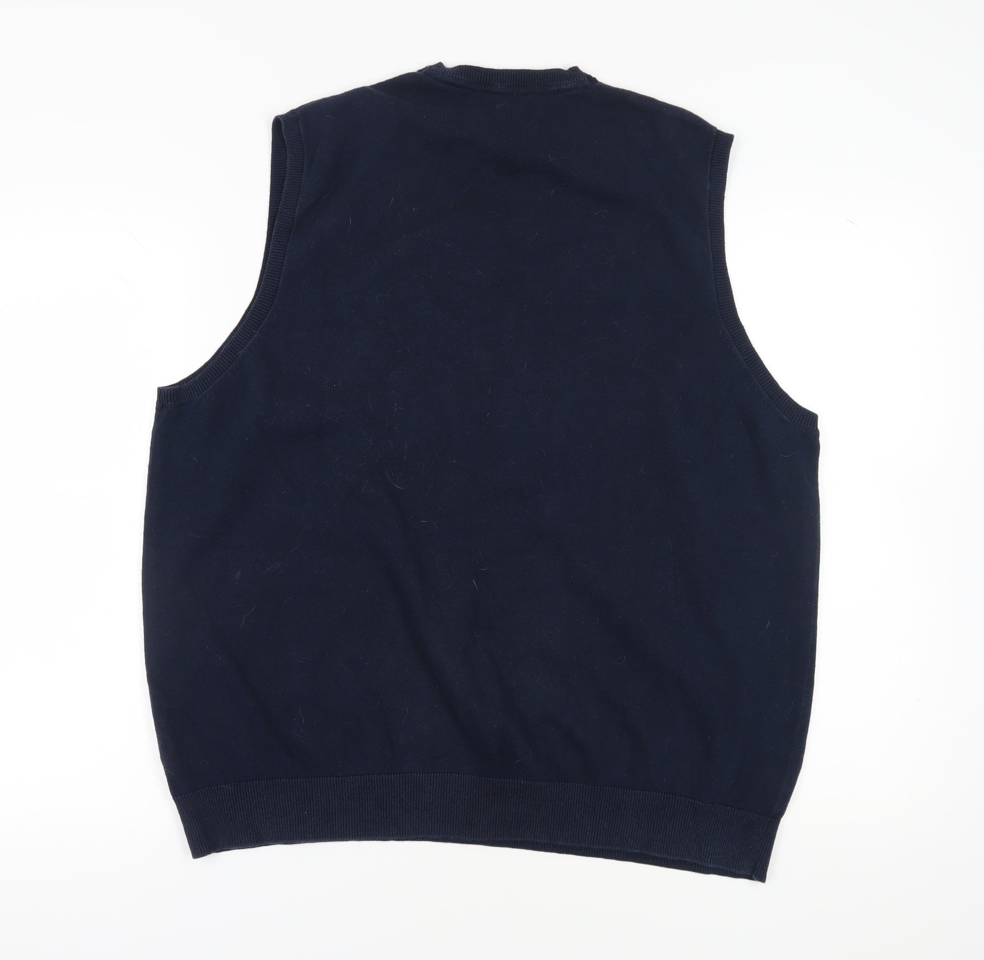 Discover comfort and style with this Marks and Spencer men's navy vest, a perfect addition to your casual wardrobe. Crafted entirely from pure cotton, this knit fabric vest is designed to offer breathability and softness, making it a comfortable choice for all-day wear. The quality of the fabric is evident in its smooth finish and robust feel, ideal for layering over a shirt or wearing alone during warmer days. The design is simple yet classic, with a V-neckline adding a timeless touch to your outfit, ensuring you can dress it up or down according to the occasion.This sleeveless jumper is coloured in a versatile navy blue that matches effortlessly with a range of outfit choices, from jeans to chinos, allowing for flexible styling options. The vest maintains a regular fit to accommodate varying body shapes while providing enough room for easy movement. It's a brilliant choice for casual gatherings, outings, or simply enjoying comfortable everyday wear.Perfectly tailored for men, this jumper falls under the 'Regular' size type and in size 2XL, ensuring it fits those seeking something neither too tight nor too loose. As a part of Marks and Spencer's reputable collection, renowned for quality and durability, this piece ensures long-lasting wear. The garment is machine washable, further adding to its practicality and ease of care, making it a stress-free choice in your busy lifestyle.Although pre-owned, the vest is in excellent condition, showing light wear but no significant flaws. Embrace a combination of elegance and comfort with this excellent piece by Marks and Spencer, making it an indispensable addition to your clothing arsenal.