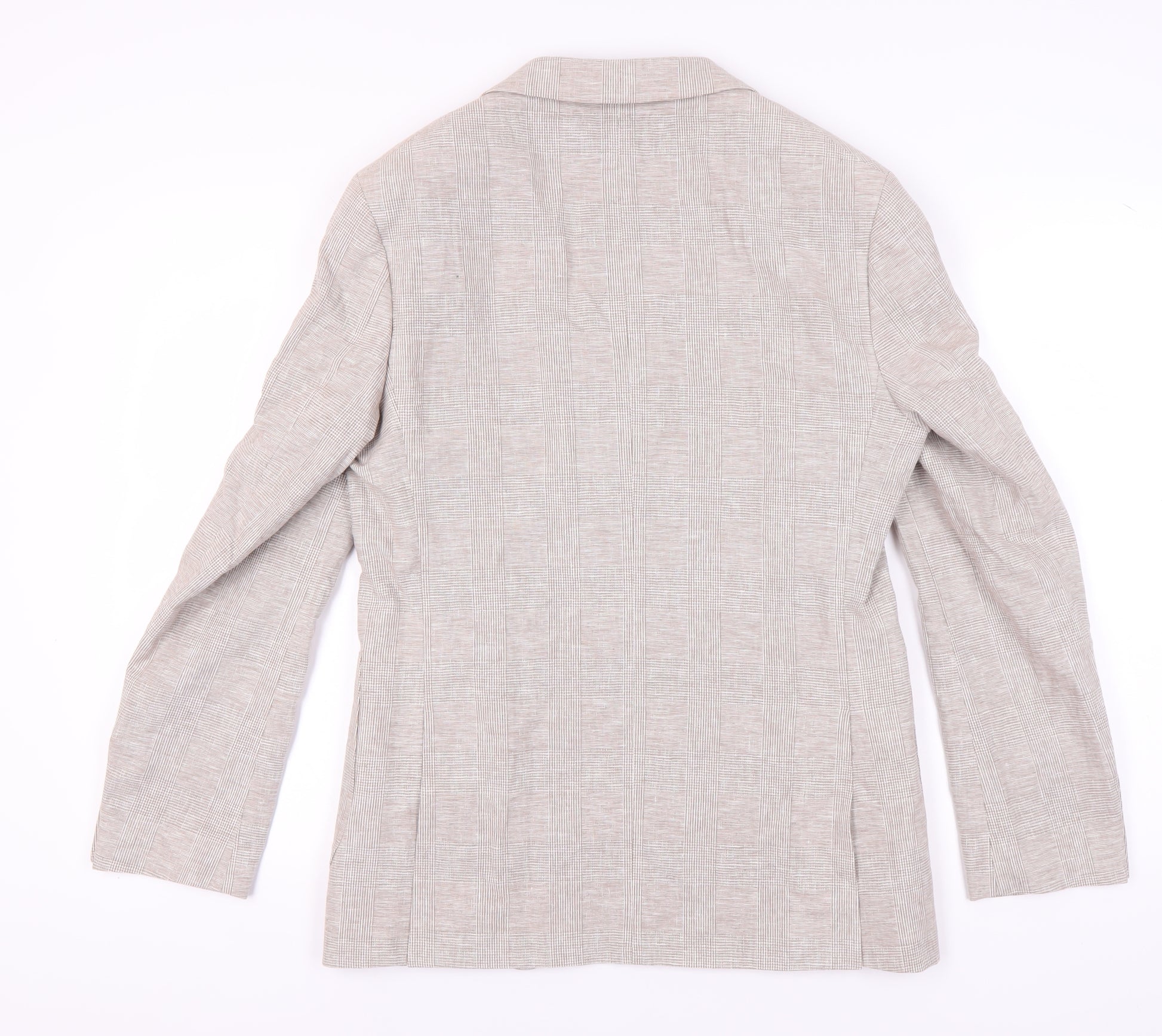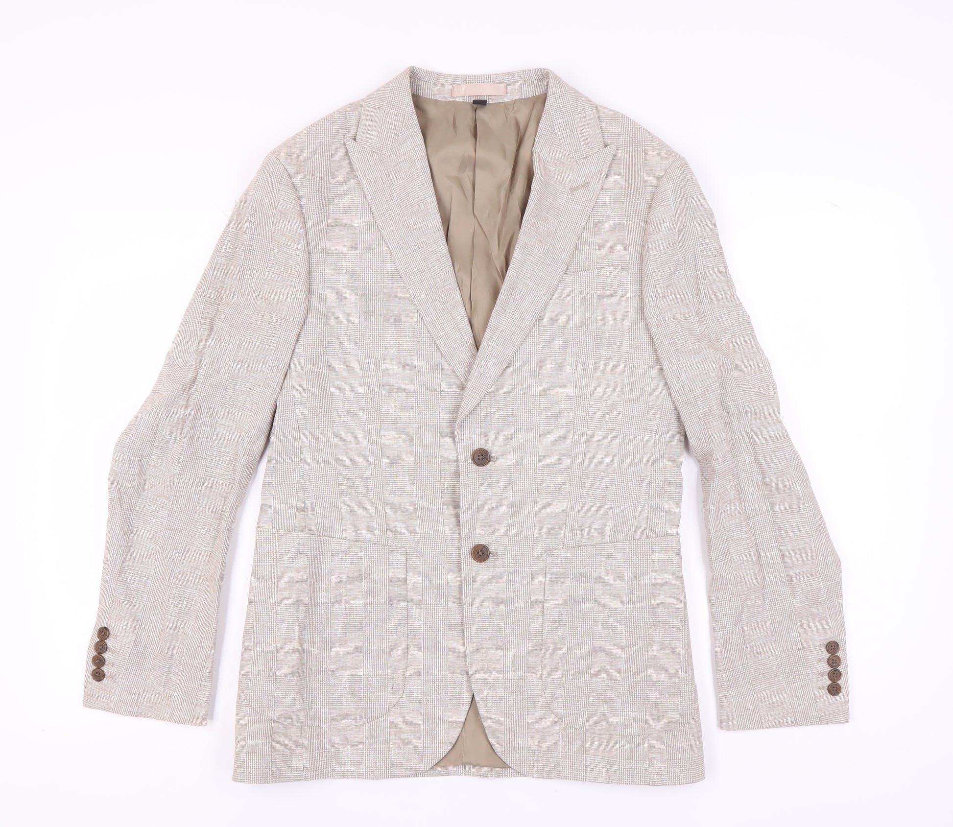 Elevate your wardrobe with this sophisticated Marks and Spencer Men's Beige Blazer. Perfect for both casual and formal occasions, this versatile piece is crafted from a premium blend of 55% flax and 45% cotton, ensuring comfort and style. With a chest size of 38 inches and a regular fit, this jacket is designed to suit medium-sized wearers, offering a classic silhouette that complements any outfit. The blazer features a stylish check pattern and a neutral beige hue, making it a timeless addition to your collection. Equipped with a notch lapel style, this single-breasted jacket adds a touch of elegance to your look. The two-button front and four-button sleeve detailing enhance its contemporary appeal. Designed for warmer seasons, this spring/summer jacket ensures you remain cool while looking sharp. Inside, the lining is crafted from a combination of polyester and viscose, providing a smooth finish. The double-vented back not only enhances mobility but also keeps you at ease throughout the day. Whether for a business meeting or a dinner date, this blazer is your go-to choice. Experience the perfect blend of style and comfort with this Marks and Spencer blazer.