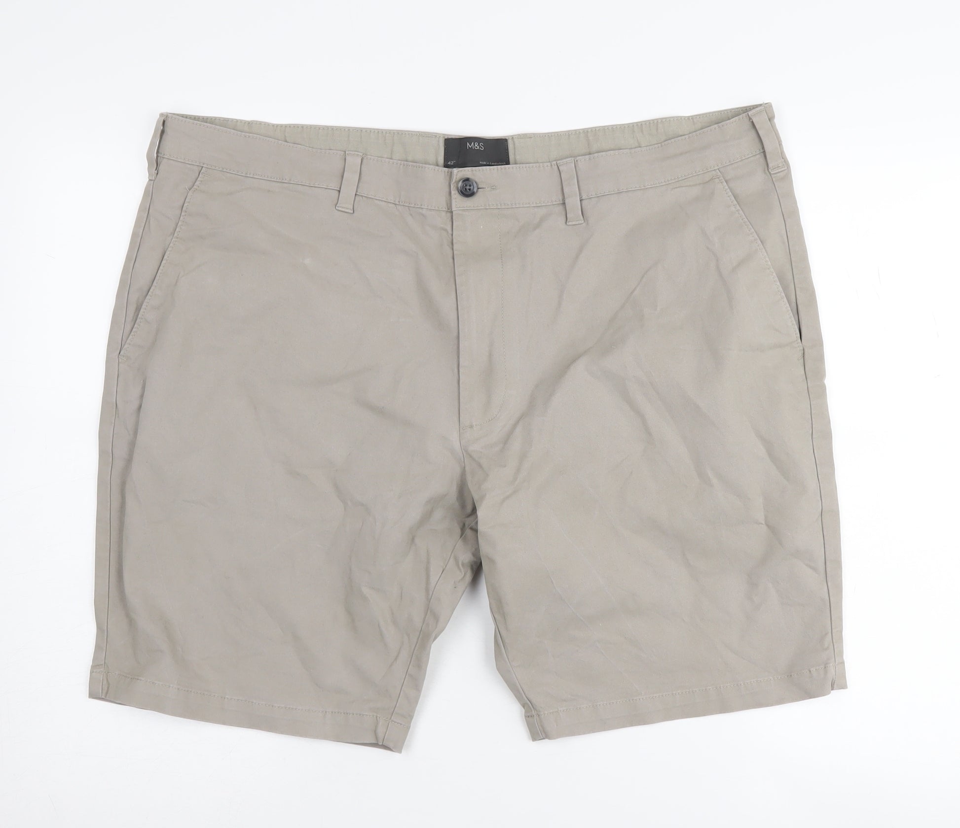 Discover timeless style with these Marks and Spencer Men's Beige Chino Shorts, an excellent addition to any wardrobe. Crafted with 98% Cotton and a touch of Elastane, these shorts offer the perfect combination of comfort and stretch, ideal for casual outings or smart-casual occasions. The flat front design provides a classic look, while the button closure ensures a secure fit. Designed to fit comfortably at the waist, these shorts boast a waist size of 107 cm (42 in), making them perfect for relaxed wear during warm weather. The beige hue adds versatility, allowing you to pair these shorts effortlessly with various shirt colours and styles. Featuring a no-pattern design, these shorts offer a minimalist aesthetic that stands out in its simplicity. The machine washable material ensures easy care, while the lightweight cotton fabric promises breathability and ease of movement. Perfect for spring or summer, these chinos are your go-to for stylish comfort. Embrace effortless style with these chinos – a staple piece that never goes out of fashion.