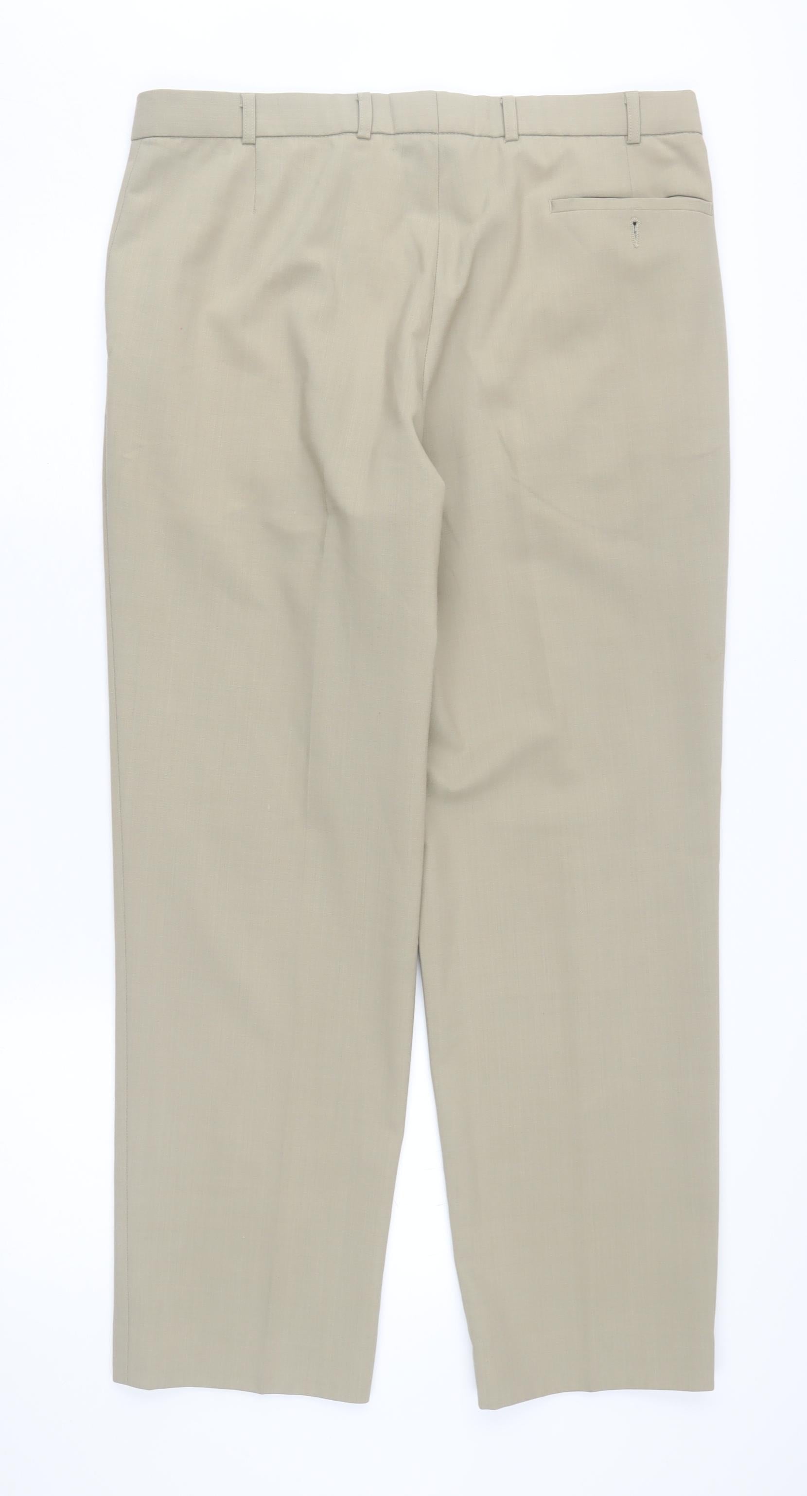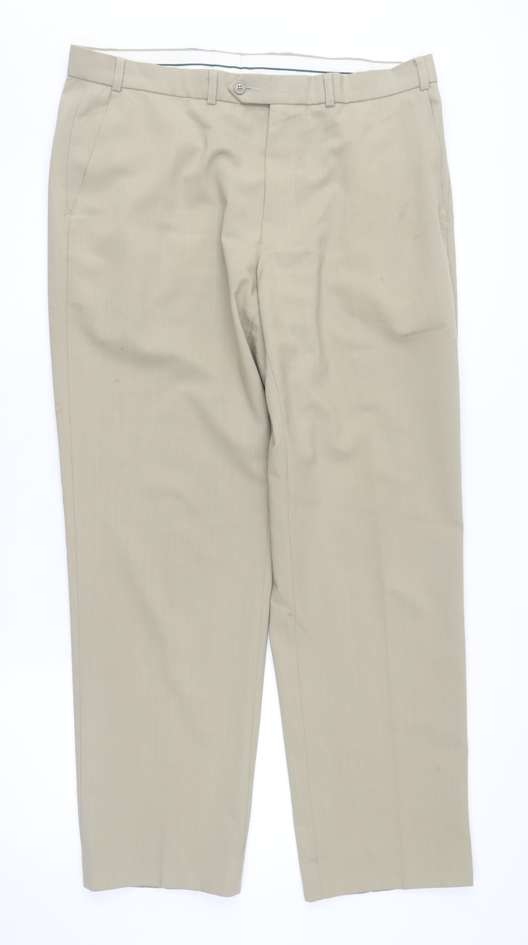 Elevate your formal wardrobe with these stylish beige trousers from Marks and Spencer, designed specifically for men who value both comfort and elegance. Expertly tailored from a blend of polyester, wool, and elastane, these trousers offer a soft and durable fabric composition that ensures a pleasant wearing experience. The regular fit design provides ample room for movement while maintaining a sleek silhouette, making them an ideal choice for a range of formal occasions, whether it's at the office or a more festive setting.The classic beige colour adds a versatile touch, easily pairing with a variety of shirts and blazers. These trousers feature a flat front and straight leg style, offering a timeless look that's both sophisticated and contemporary. With a mid-rise waist of 36 inches and an inside leg measurement of 31 inches, they cater to those needing regular sizing. The secure button and zip closure ensures confidence in wear, while the slash pockets offer convenient storage for essentials.Perfect for the cooler seasons of autumn, spring, and winter, these trousers are recommended for dry cleaning only to retain their quality and longevity. Despite some minor stains, which have been considered in the pricing, these trousers still hold their stylish allure. Priced competitively, they're a great addition to any gentleman's wardrobe, promising both style and practicality. Don't miss out on adding this essential piece to your ensemble, embodying the quality and style that Marks and Spencer is renowned for. Enhance your formal appearance with these sophisticated trousers today.