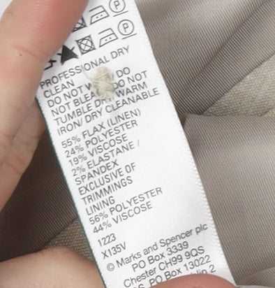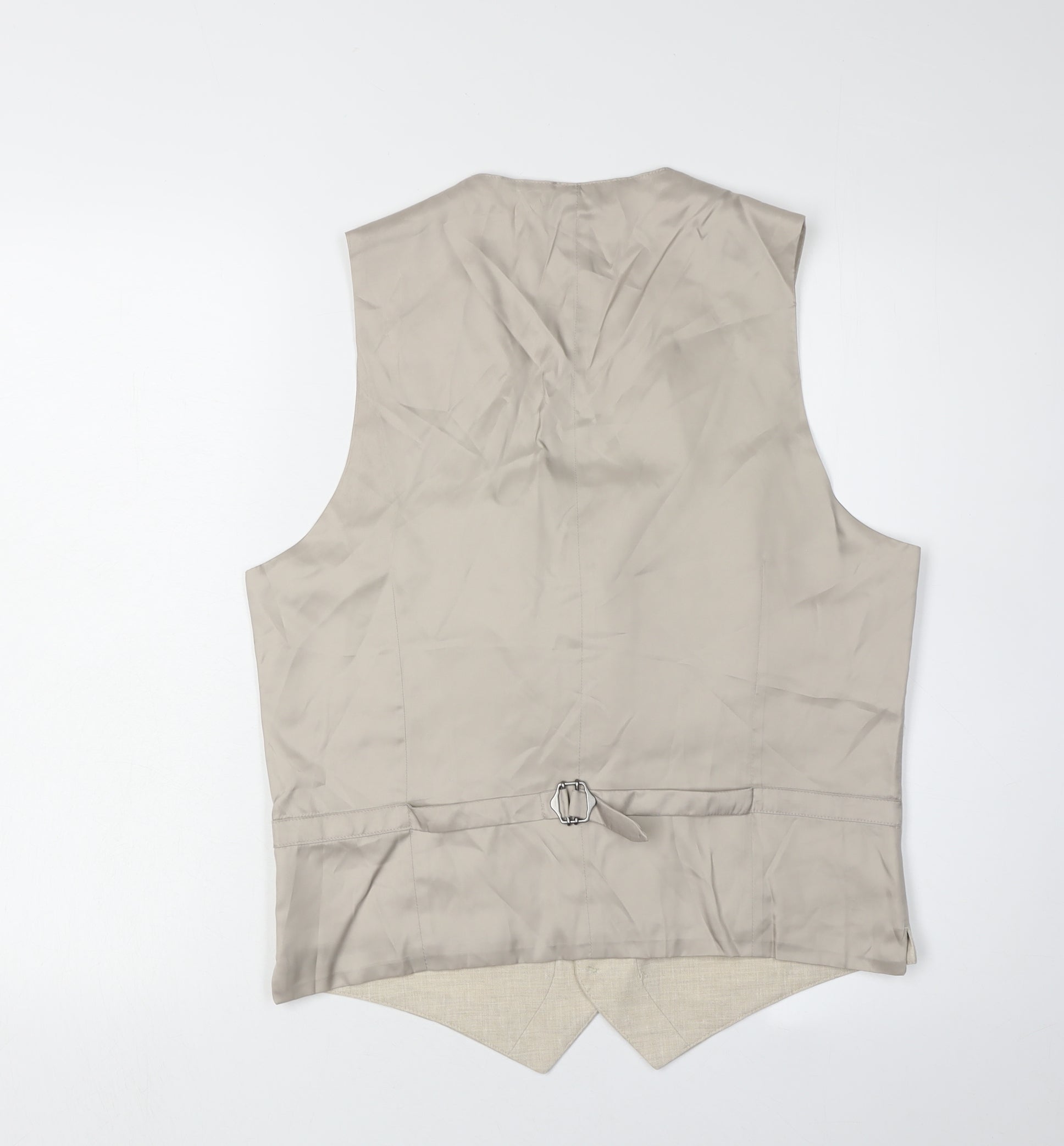 Elevate your formal attire with this sophisticated Marks and Spencer Men's Waistcoat in a classic beige hue. Crafted from a high-quality blend of 55% linen, 24% polyester, 19% viscose, and 2% elastane, this waistcoat offers a perfect balance of comfort and style. It features a sleek, modern design that's ideal for a variety of occasions, from weddings to business meetings.With a chest size of 38 inches and designed for regular fit, this waistcoat ensures a comfortable and flattering look. The clean lines and minimalistic design make it a versatile piece that can easily be matched with your favourite suit or formal trousers. The waistcoat, being new with tags, promises pristine condition, free from any imperfections.The interior is lined with a smooth blend of polyester and viscose, offering a touch of luxury against your skin. The classic button-down front and waist adjuster at the back allow for a personalised fit, enhancing the tailored silhouette.This Marks and Spencer beige waistcoat is a must-have addition to any gentleman's wardrobe, providing an effortless way to elevate your formal ensemble. Whether you're heading to a corporate event or a special celebration, this waistcoat is sure to make a refined statement. Priced competitively, this piece offers both quality and value, making it an ideal choice for anyone looking to enhance their formalwear collection. Don't miss the opportunity to own this elegant and timeless piece.