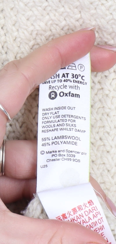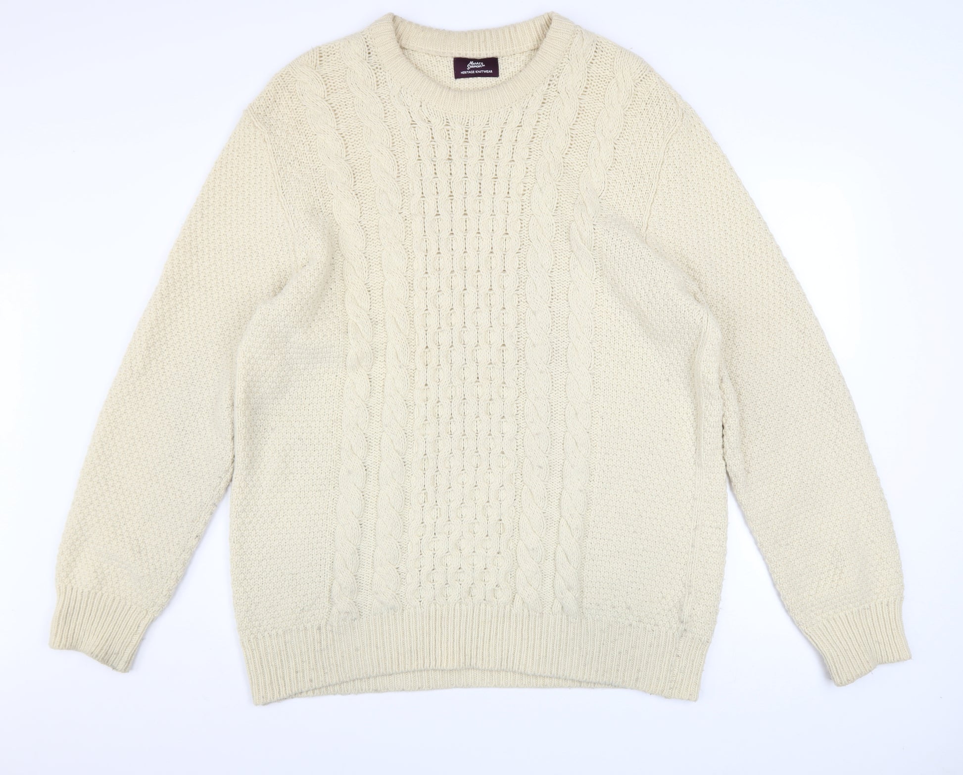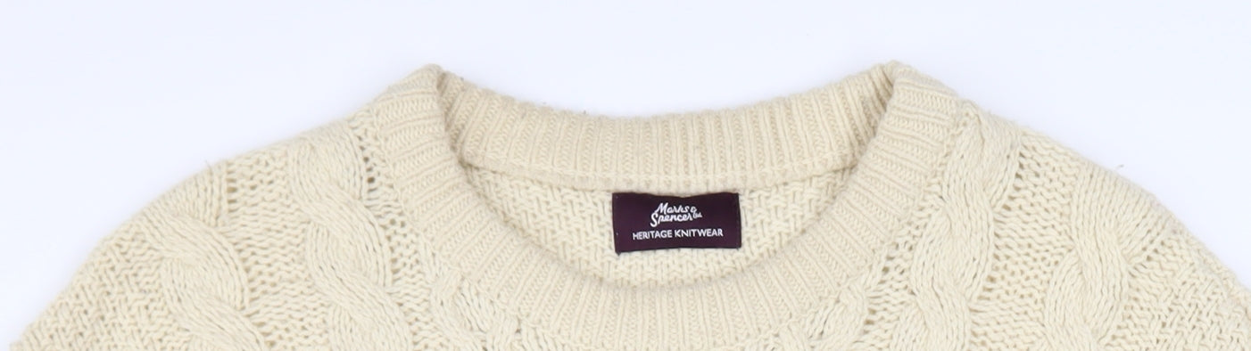 Stay warm and stylish with this classic Marks and Spencer Heritage Knitwear men’s jumper, crafted in a soft wool-rich blend for cosy comfort during the cooler months. The timeless beige tone ensures a versatile look that pairs easily with jeans or chinos for an effortlessly refined casual outfit. Made from 55% lambswool and 45% polyamide, the jumper offers both warmth and durability, giving you the perfect balance between softness and practicality.The cable-knit front design adds a touch of traditional charm, while the crew neckline and ribbed cuffs and hem deliver a neat, structured fit. Its regular fit provides comfort and ease of movement, making it ideal for layering over shirts or wearing alone for a relaxed, polished look. Designed for all seasons, this jumper adapts comfortably to varying temperatures—keeping you cosy in autumn and winter yet breathable enough for cool spring days.Carefully constructed with quality stitches and a natural texture, it reflects Marks and Spencer’s longstanding reputation for reliable craftsmanship. With a wool-rich composition and cable-knit detailing, this piece embraces timeless British knitwear style. Perfect for weekend walks, smart-casual office days, or laid-back evenings, it’s an essential addition to any wardrobe. Although there is light wear visible on the sleeves, the garment remains in very good condition overall, maintaining its attractive appearance and softness. This used item represents excellent value compared to new retail alternatives, making it an affordable way to enjoy a high-quality wool jumper from a trusted high street brand like Marks and Spencer.Machine washable at 30°C with wool-friendly detergent, it’s easy to care for and built to last. Whether you’re shopping for warmth, comfort, or timeless style, this beige cable-knit jumper promises enduring charm and dependability, season after season. Ideal for men who appreciate classic knitwear with a heritage feel, it’s a smart investment piece for your casual wardrobe.