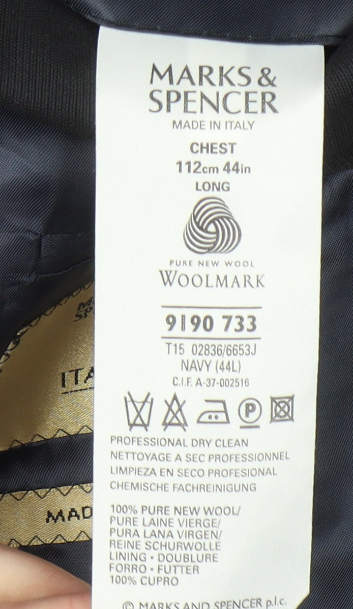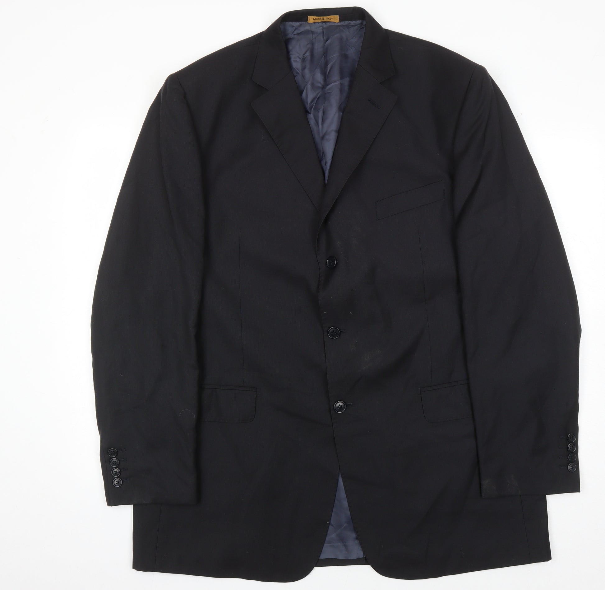 Enhance your formal collection with this elegant Marks and Spencer blazer, designed with the discerning gentleman in mind. Crafted in premium pure new wool, this luxurious blazer offers a refined look perfect for business meetings or sophisticated evening events. Tailored for a regular fit, the garment ensures comfort while maintaining a sharp silhouette. The classic black colour complements various attire, establishing its versatility in any wardrobe. Measuring a chest size of 44 inches and in a long length, this piece caters to those who value both style and fit. Featuring a single-breasted front with three-button closure, this blazer showcases notch lapels for a timeless appeal. Fully lined with 100% cupro, it offers a smooth touch, enhancing the overall comfort and durability. Equipped with inner pockets, it combines functionality with elegance. This blazer is the ideal choice for autumn and winter seasons, ensuring warmth without sacrificing style. Suitable for both business and formal occasions, it is a must-have for any gentleman aiming to impress. Priced affordably, make this Marks and Spencer blazer the next indispensable piece in your collection.