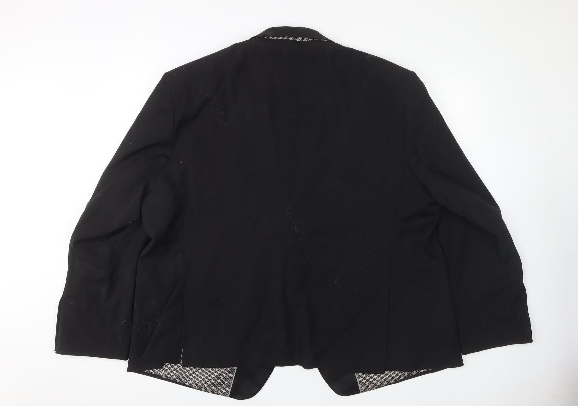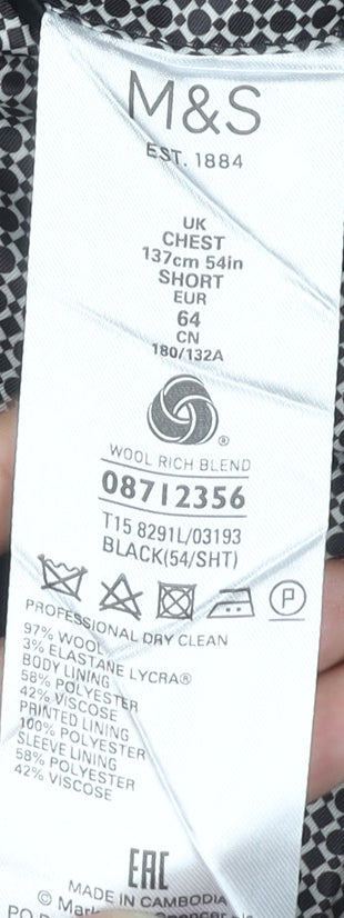 Elevate your formal wardrobe with this elegant Men's Black Blazer from Marks and Spencer. Designed for a sophisticated look, this short fit jacket is crafted from a luxurious blend of 97% wool and 3% elastane, ensuring comfort and durability. The jacket features a notch lapel style, a single-breasted cut, and a two-button front style that presents a classic and refined appearance. The double-vented back provides ease of movement, while the convenient inner pockets offer practicality. This blazer is ideal for formal occasions, whether it's a business meeting or a special event. The lining, composed of polyester and viscose, complements the blazer's high-quality craftsmanship. Despite a slight tear that requires repair, the blazer maintains its stylish appeal, making it a valuable addition to your wardrobe at an affordable price. Perfect for the discerning gentleman, this jacket effortlessly blends traditional style with contemporary functionality. Don't miss out on this timeless piece that will pair seamlessly with a variety of ensembles.