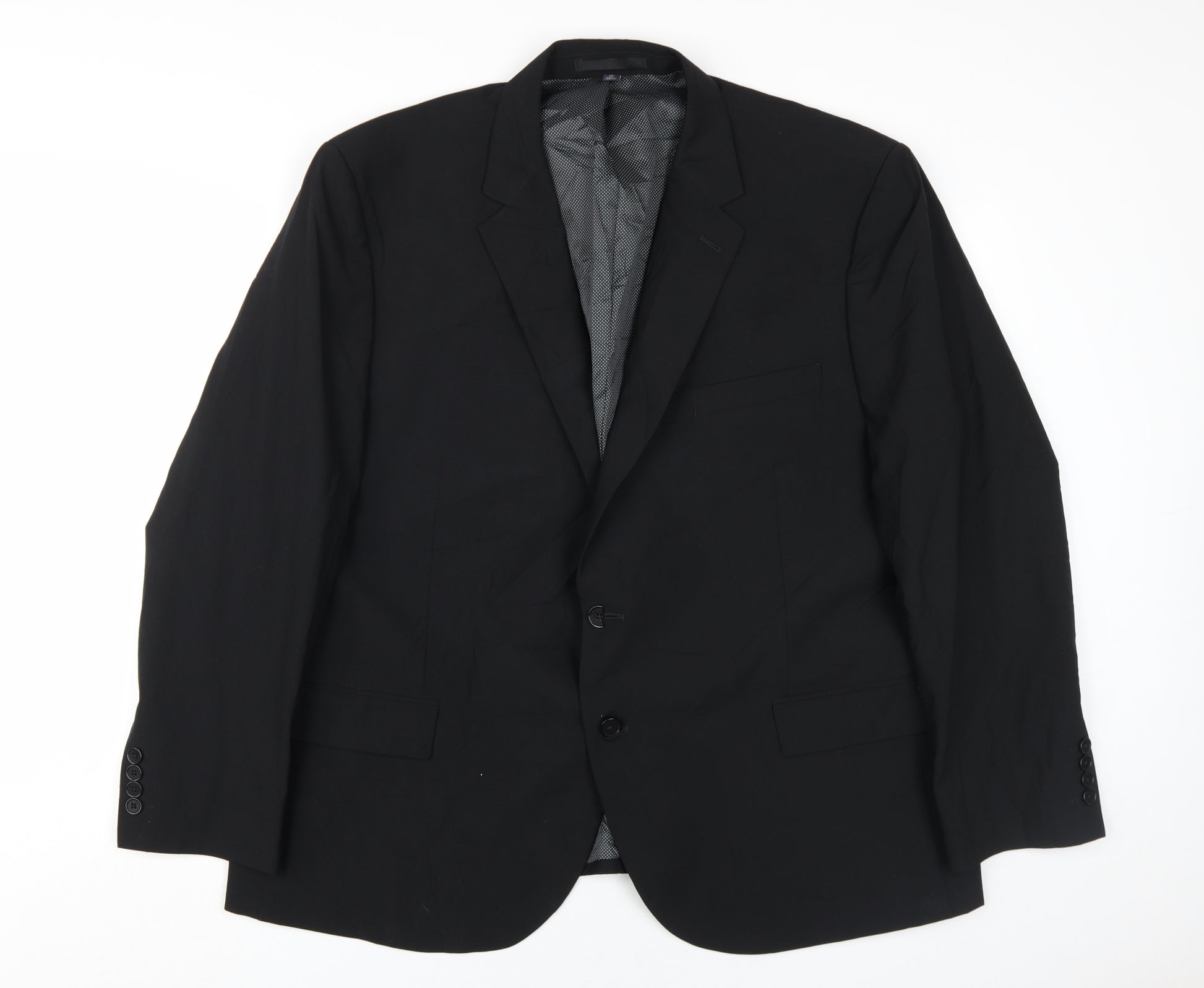 This classic black blazer from Marks and Spencer is a versatile addition to any wardrobe, ideal for both business and formal occasions. Designed for men, this smart piece features a regular fit and is tailored with a notch lapel style, offering a sophisticated touch. The blazer is crafted from a wool-rich blend, ensuring comfort and durability with its material composition of 53% wool, 43% polyester, and 4% elastane. The jacket is lined with polyester for added comfort and a polished finish. Suitable for autumn and winter seasons, this blazer comes in a size 48 with a chest size of 48 inches, ensuring a comfortable fit. It is a single-breasted design with a two-button front closure, complemented by four buttons on the sleeves. The double-vented back provides ease of movement and an elegant silhouette. Despite being pre-owned, the blazer is in excellent condition with only slight wrinkles present, requiring professional dry cleaning to maintain its pristine appearance. Perfect for business meetings or formal gatherings, this black blazer offers timeless style and functionality.