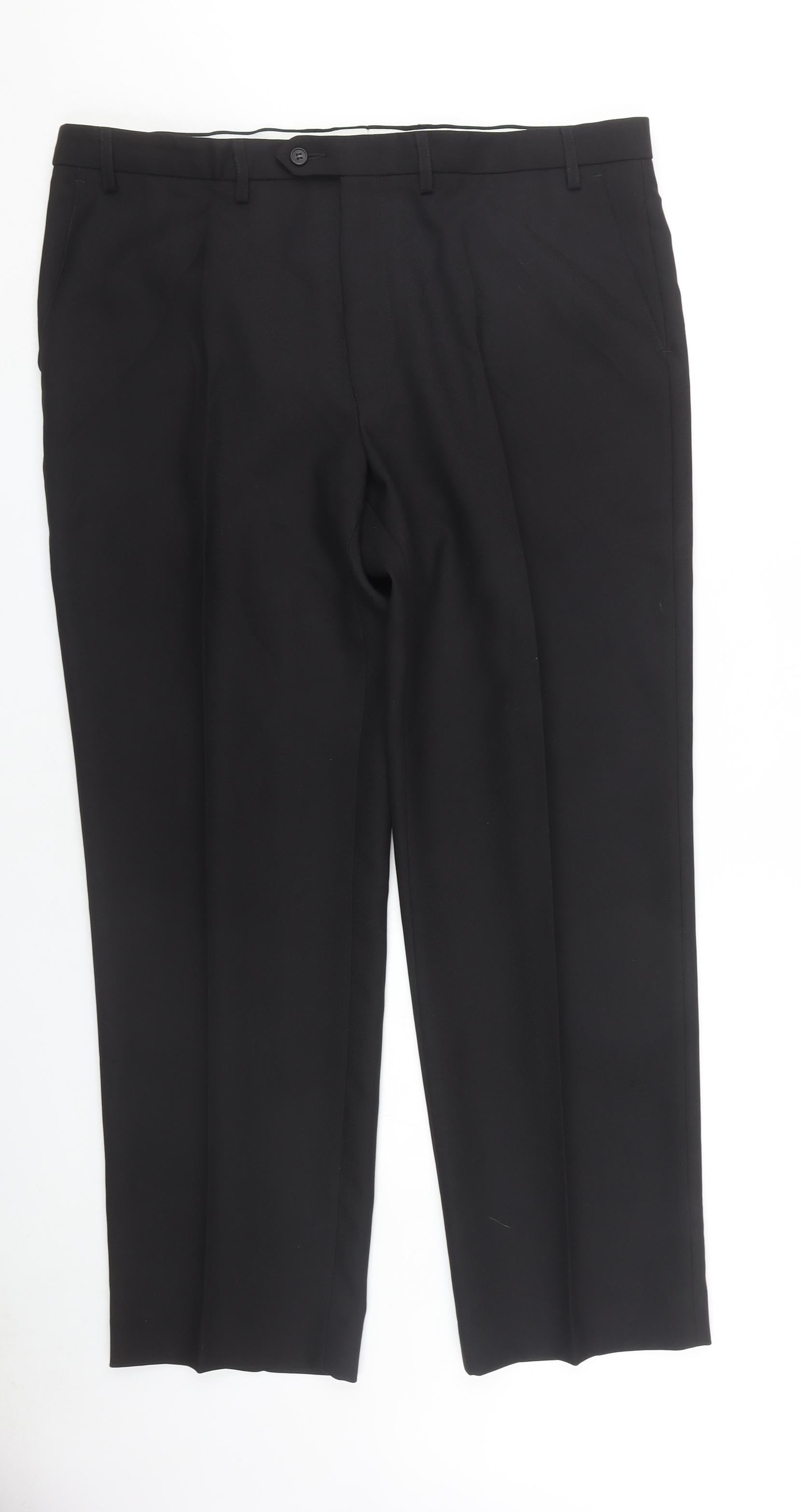 Introducing these classy Marks and Spencer Men's Dress Pants, tailored for any formal or business occasion. Crafted in a sleek black colour and designed in a sophisticated straight leg style, these trousers are a perfect addition for a modern wardrobe. Made from 100% polyester, they ensure durability and comfort for the wearer, maintaining a clean and sharp look throughout the day. The trousers feature a flat front and a secure button closure, providing both a stylish and functional fit for daily wear. With a generous size of L and a 40-inch waist size, these pants are tailored to offer a comfortable fit. The inside leg measures 31 inches, making them ideal for a well-proportioned silhouette. Designed to be crease resistant, they ensure you stay polished whether you're at work, attending a formal event, or out for an elegant dinner. These trousers from Marks and Spencer are machine washable, adding to the practicality of these high-quality pants. Perfectly embodying the classic style with no pattern distraction, they create an elegance suited to any setting. A mid-rise ensures they sit comfortably on the waist, offering a streamlined appearance. Complete with the assurance of new with tags, these trousers are an essential addition for anyone seeking quality and style. Don't miss the chance to add these versatile, stylish black dress pants to your collection, timelessly combining sophistication with everyday practicality.