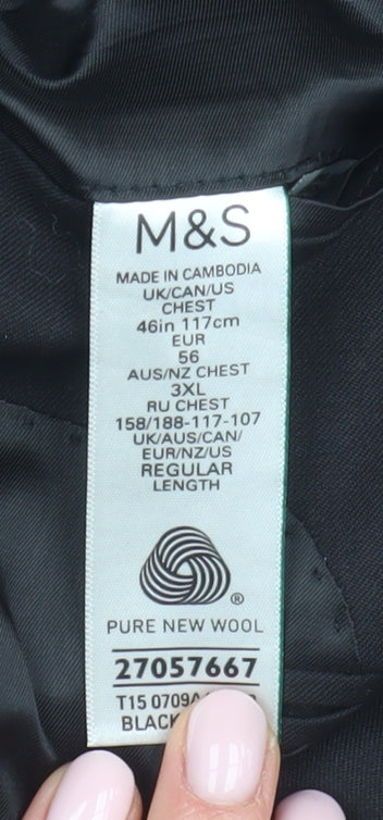 Step out in sophistication with this elegant black blazer from Marks and Spencer, crafted for the discerning gentleman. Made from 100% pure new wool, this blazer is not only a statement of style but also a testament to superior quality and craftsmanship. The regular fit ensures comfort and a classic look, making it a versatile addition to any wardrobe. The garment's single-breasted design and notch lapel offer timeless appeal, suitable for both business and formal occasions. With a regular jacket length, it drapes elegantly, complementing your silhouette perfectly. The jacket features a practical two-button front, providing a secure and stylish closure. Additionally, the single-vented back ensures ease of movement and added comfort. The interior is lined with a blend of polyester and viscose, adding a smooth finish and enhancing comfort. Despite being pre-owned, its condition is excellent, showing minimal signs of wear, ensuring long-lasting style and resilience. Truly a must-have piece for those seeking a blend of tradition and modernity in their attire.