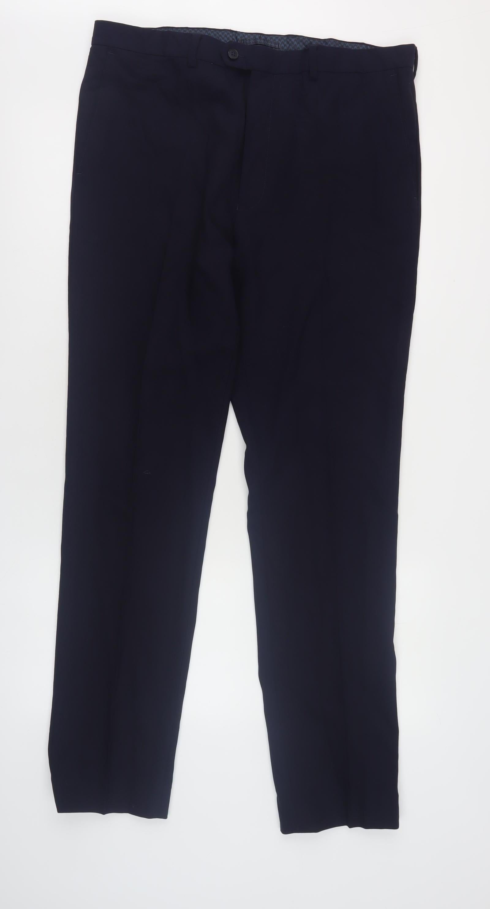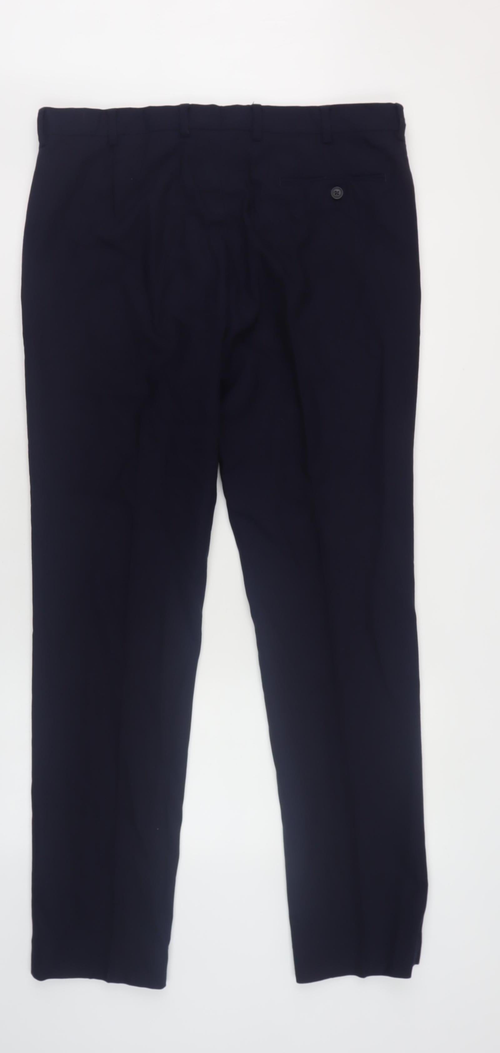 Elevate your formal wardrobe with these classic black dress pants from Marks and Spencer. Designed for the modern man seeking sophistication and comfort, these trousers are crafted in a luxurious wool-rich blend, providing warmth and a soft feel against the skin. The slim fit offers a contemporary silhouette, perfect for business meetings or elegant evening events. These trousers feature a practical flat front and a mid-rise, ensuring a comfortable and stylish look whether paired with a crisp white shirt or a smart blazer. The straight leg style offers a timeless appeal, suitable for various occasions, from formal gatherings to professional settings. With a waist size of 36 inches and an inside leg of 33 inches, these trousers come in a regular size type, ensuring the perfect fit. The trousers are equipped with a classic button and zip closure for ease of wear. Keep your essentials near with the convenient slash pockets. Easy to maintain, these dress pants are dry clean only, ideal for the busy professional. Make these sleek dress pants a staple in your wardrobe. Featuring a brand new condition with tags, these trousers promise long-lasting wear and timeless style. Ideal for the fashion-forward man, these Mark and Spencer trousers offer unparalleled versatility and elegance, making them a must-have addition to your collection. Discover the perfect union of durability and luxury with these fine black dress pants, ready to impress at any occasion.