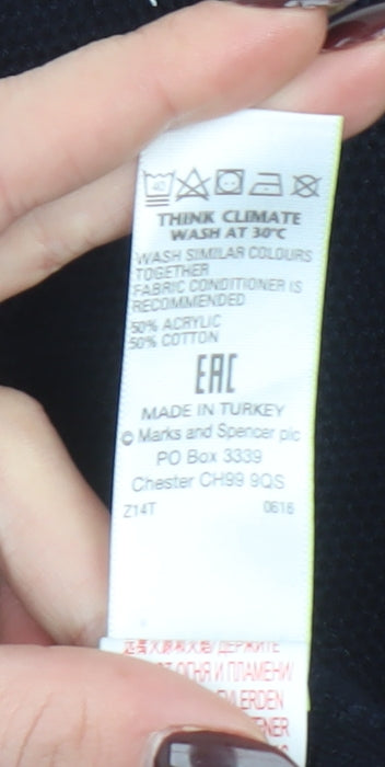 This elegant black cardigan from Marks and Spencer’s Limited Edition collection is a versatile addition to any wardrobe. Designed in a tailored slim fit, it combines modern sophistication with timeless comfort. Crafted from a high-quality cotton-rich blend of 50% cotton and 50% acrylic, it offers breathability, softness, and durability in equal measure. The cardigan features a classic V-neckline and a full front button fastening, making it easy to layer over shirts or T-shirts for a polished or relaxed look. Ideal for both business-casual environments and weekend wear, it provides a flattering silhouette that complements the wearer’s shape without restricting movement. The finely knit structure ensures a lightweight yet warm feel, suitable for year-round layering, especially in spring, autumn, and winter. Finished in a pure black tone, it pairs effortlessly with trousers, jeans, or chinos, adding smart sophistication to any outfit. The ribbed cuffs and hem help maintain shape and give the garment a neat finish. Machine washable for practicality, this cardigan is easy to care for and built to last. Although in excellent condition with only light lint visible, this makes it a great value find for those who appreciate quality craftsmanship and enduring style. Whether for office layering, weekend outings, or everyday smart-casual wear, this Marks and Spencer cardigan offers a perfect balance of style and comfort. A dependable classic piece that every man’s wardrobe can benefit from, it delivers understated elegance and wearability. Perfect for those seeking a refined knitwear option that works for multiple occasions, making it a practical and stylish investment piece.