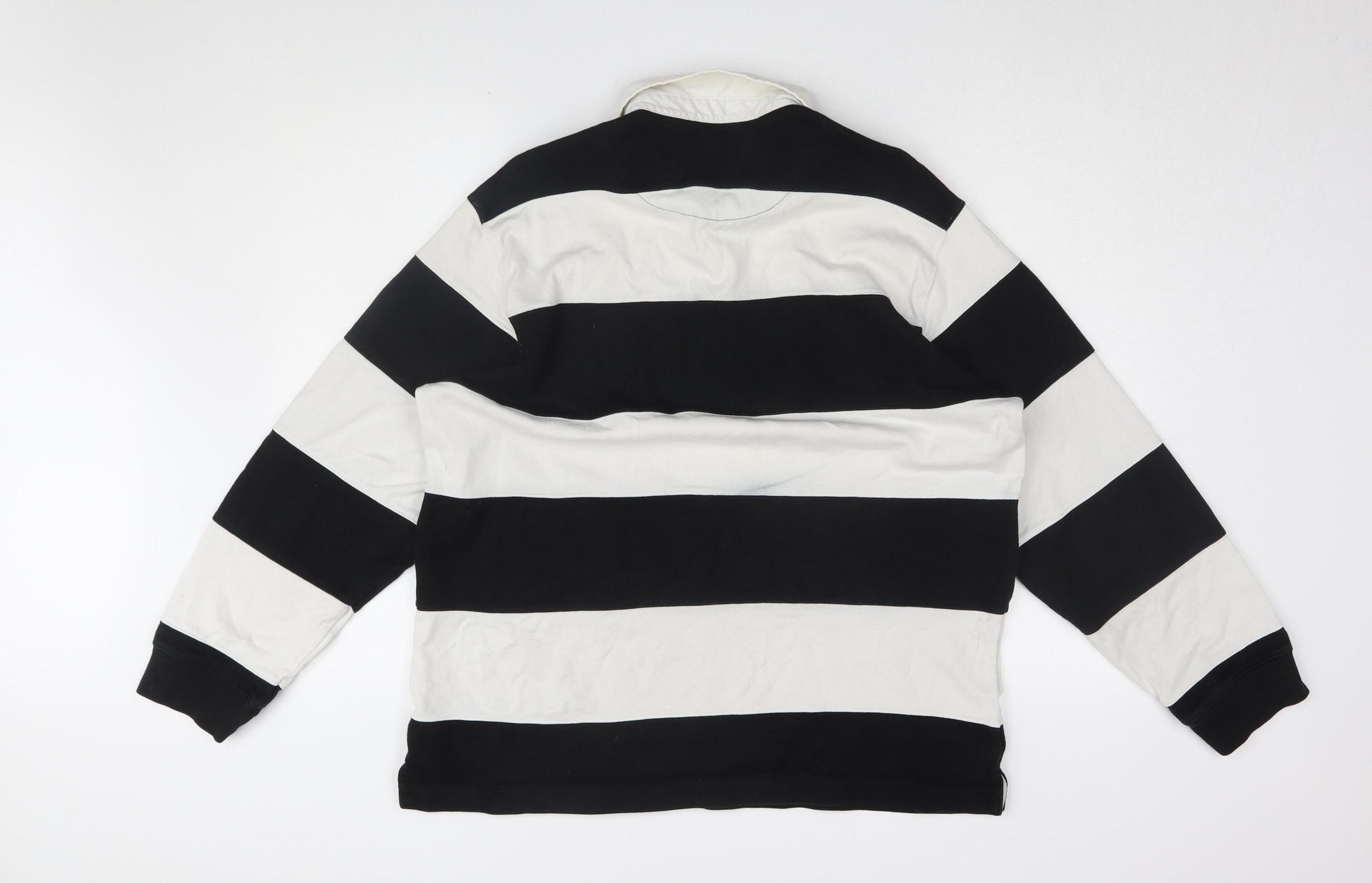 Elevate your wardrobe with this sophisticated Marks and Spencer men’s polo in a classic black and white striped pattern. Crafted with meticulous attention to quality, this versatile polo is made from 100% cotton, ensuring a soft and breathable experience with every wear. Ideal for casual occasions, its long sleeves provide added warmth and style during cooler months. The collared neckline and point collar style enhance its classic appeal, making it a staple addition to any fashion-forward collection.Designed for men, this regular fit large size polo comfortably fits chest sizes between 104-109 cm. Whether paired with jeans for a relaxed look or chinos for a more refined occasion, its athletic aesthetic is sure to make a statement. The machine washable fabric ensures easy maintenance, while the high-quality cotton promises durability and longevity.Despite its excellent pre-loved condition, subtle signs of minimal wear add a unique character, reflecting the timeless elegance of Marks and Spencer craftsmanship. Ideal for the modern man seeking both comfort and style, this polo offers a blend of tradition and contemporary design. Perfect for a range of settings, from casual outings to informal gatherings, it stands as a testament to the enduring charm of classic menswear.