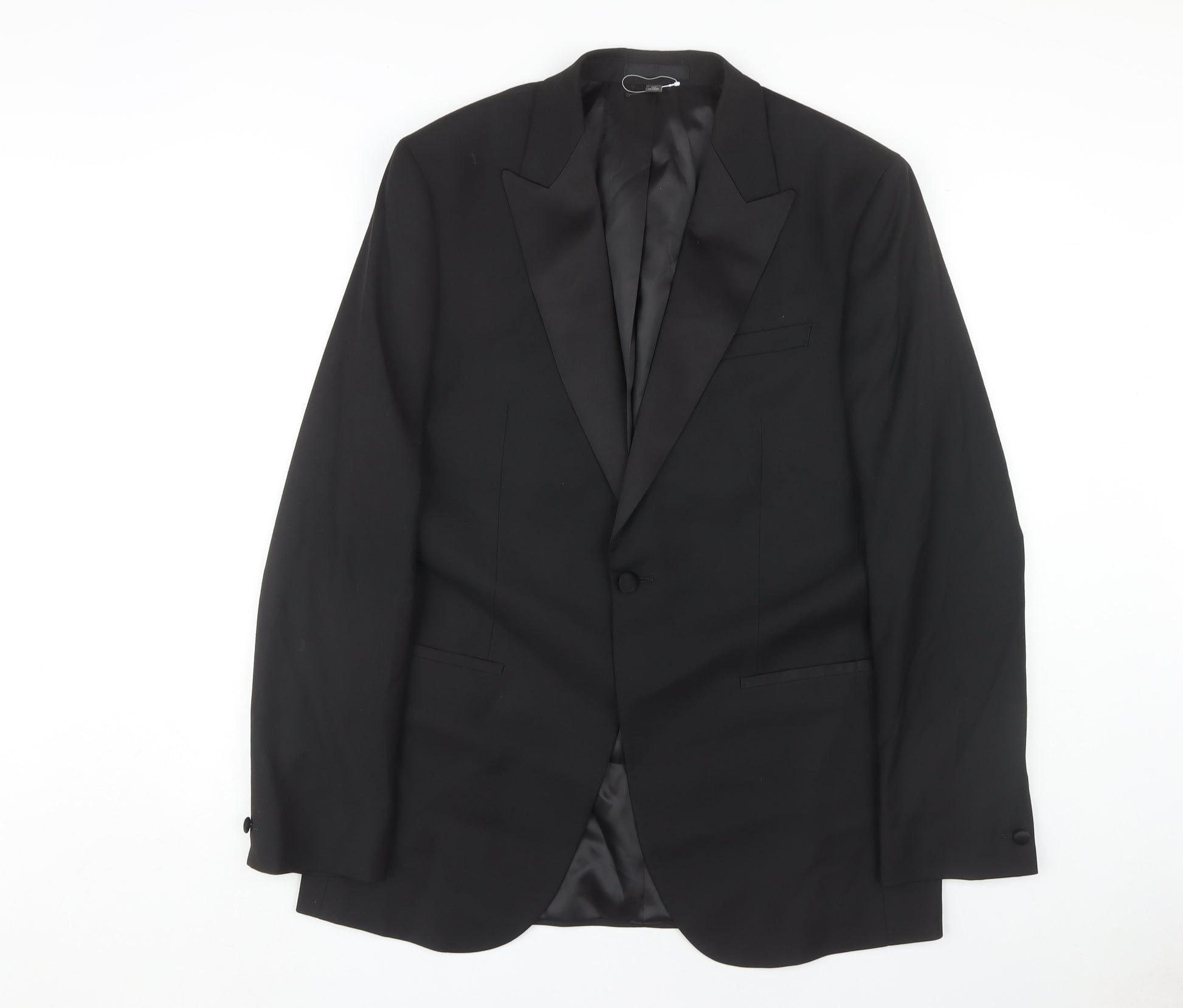 Presenting the quintessential black blazer tailored for the modern gentleman by Marks and Spencer. Rendered in a rich blend of polyester, viscose, and elastane, this blazer offers both comfort and a sleek silhouette. Designed in a long length, it provides a flattering fit that complements any look, from business meetings to dinner dates. The one-button front closure accentuates its contemporary style, while the shawl lapel adds a touch of classic elegance. Double-vented design allows for free movement while maintaining an elegant drape. The fully lined interior, crafted from polyester, ensures peak comfort and a luxurious feel. Perfect for year-round wear, it effortlessly transitions across occasions, be it a casual outing or a formal event. In excellent condition with no visible wear, this sophisticated piece embodies timeless style, poised to elevate your wardrobe. Secure this must-have blazer today and redefine your fashion narrative with its irresistible charm.