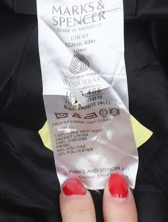 Elevate your formal wardrobe with this sophisticated Marks and Spencer Men's Blazer. Crafted with precision, this single-breasted jacket in a classic black and white colourway offers a timeless look suitable for any occasion. The blazer is made from premium wool, ensuring warmth and comfort during the autumn and winter seasons. Featuring a long coat length, notch lapels, and a two-button front closure, this piece embodies elegance and style. The interior is lined with luxurious viscose, providing a smooth touch against the skin. With a chest size of 40 inches, this jacket is designed for the regular-sized man, offering a perfect fit. The stylish four-button cuffs and double-vented back add functional and aesthetic elements to this versatile garment. While the blazer shows minimal signs of wear with slight creasing, it remains in excellent condition, ready to enhance any outfit with its classic charm. Whether you're attending a formal event or a business meeting, this blazer promises to deliver a polished and refined appearance. Professional dry cleaning is recommended to maintain its pristine quality. Don't miss the opportunity to own this exquisite piece from Marks and Spencer, known for its exceptional craftsmanship and classic designs.