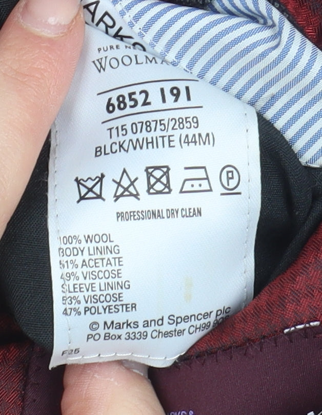 Elevate your wardrobe with this classic Marks and Spencer men's blazer, designed to add sophistication to any formal occasion. Crafted from 100% pure wool, this blazer offers both warmth and style, making it an ideal choice for autumn and winter months. The black colour provides a versatile base, allowing effortless pairing with trousers or jeans. Featuring a regular fit and a notch lapel style, this single-breasted blazer ensures you step out in confidence. The two-button front adds to its timeless appeal, complemented by four-button sleeves and a double-vented back for ease of movement. The blazer is fully lined with a combination of acetate, viscose, and polyester, providing a smooth and comfortable wear. With no visible patterns, the simplicity of this design underscores its elegance. The condition of the blazer is excellent, showing no signs of wear, although it is free of original sales tags. Suitable for formal occasions and professional settings, this piece is a staple for any man's wardrobe. Don't miss out on the chance to own this high-quality Marks and Spencer blazer at an affordable price.