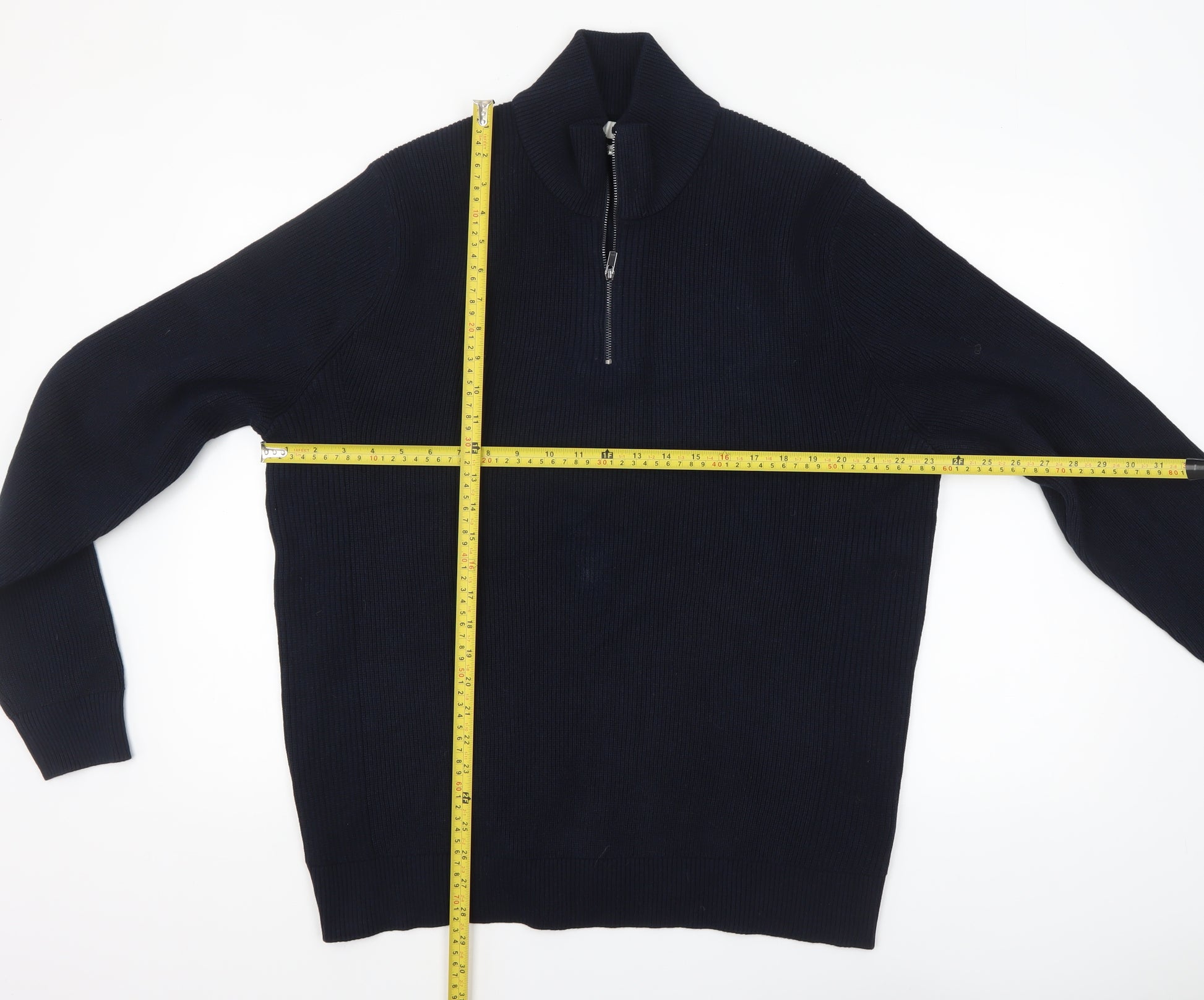 Elevate your everyday wardrobe with this classic Marks and Spencer men’s black half-zip jumper, designed to blend timeless appeal with modern practicality. Crafted from a soft and durable cotton blend, this jumper offers a perfect balance of warmth and comfort. The ribbed knit texture provides subtle structure and a premium feel, while the breathable fabric composition of 90% polyester and 10% cotton ensures it remains lightweight and versatile enough for year-round wear. The high neck design adds both style and functionality, keeping you comfortable on cooler days, and the convenient half-zip front allows for effortless layering and adjustable warmth. Cut in a regular fit, it provides a relaxed yet flattering silhouette that works well over shirts or T-shirts, making this jumper ideal for casual, travel, or workwear settings. The long sleeves and elasticated cuffs create a secure fit that maintains its shape over time, while the understated design complements any outfit, from jeans to chinos. In an enduring black colour, it remains a versatile wardrobe staple suitable for autumn, winter, and spring styling. Marks and Spencer’s reputation for quality craftsmanship is reflected in the clean finish and resilient fabric that is machine washable for easy care. Perfect for men seeking smart comfort and effortless style, this jumper is ideal for weekend outings, office wear, or layering under coats during colder days. In excellent pre-owned condition with only minimal signs of gentle use, this item has been well maintained with no visible flaws or damage. Style meets practicality in this refined yet casual piece—an everyday essential that embodies the dependable comfort and modern polish you expect from Marks and Spencer. A reliable layering option that promises versatility and warmth season after season.