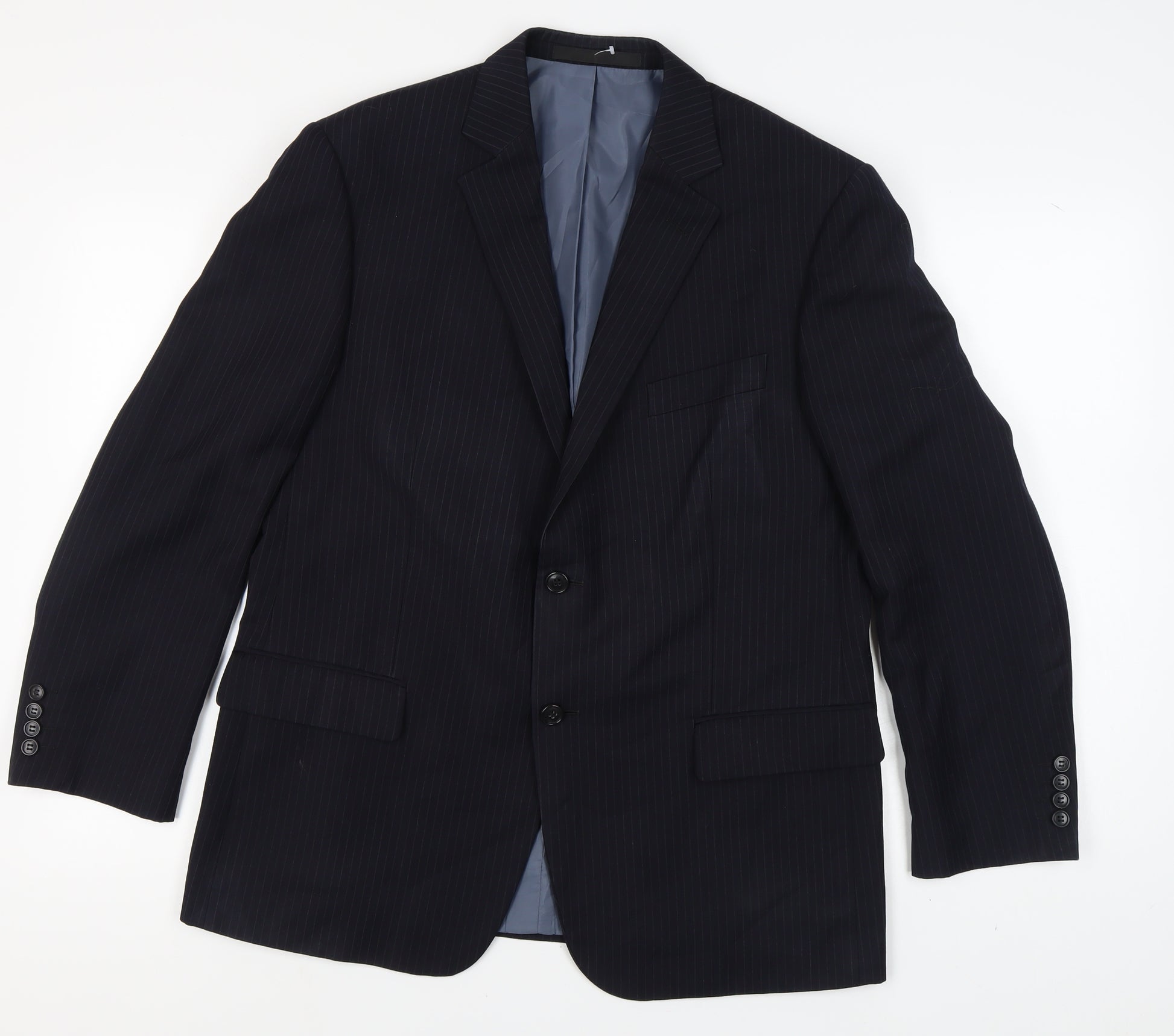 Discover the elegance of this Marks and Spencer men's suit jacket, impeccable for business or formal occasions. Crafted with a premium wool-rich blend, this jacket boasts a sophisticated navy blue, striped design that seamlessly integrates style with comfort. Its classic single-breasted cut and notch lapel exude timeless appeal, while the short, tailored fit ensures you remain fashion-forward. Tailored for gentlemen seeking both quality and style, this jacket is lined with polyester to enhance its durability and feel. With a four-button sleeve detail and double-vented back, functionality blends effortlessly with aesthetics. Ideal for the modern man, it’s perfect for making a confident statement at any event. Although used, this jacket remains in excellent condition, maintained to the highest standard. Add this highly versatile piece to your wardrobe and elevate your sartorial game.