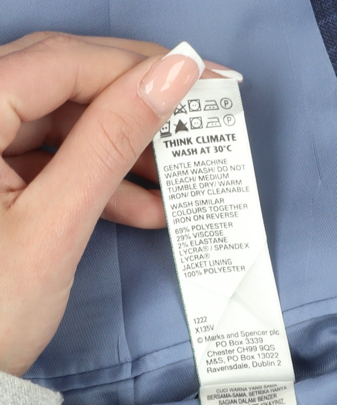 Enhance your wardrobe with this stylish Marks and Spencer men’s blazer. Tailored with a modern slim fit, this blazer is a versatile addition perfect for both business and formal occasions. Crafted predominantly from polyester, it provides durability as well as comfort, while the touch of elastane ensures a flexible fit. The rich blue colour, complemented by a subtle check pattern, offers timeless elegance ideal for those looking to make a refined statement. Equipped with classic two-button fastening, four-button sleeves, and a single-vented back for ease of movement, it is completed by notch lapels and functional inner pockets for added practicality. Perfect for the autumn and spring seasons, this blazer combines style with functionality, making it a must-have for business meetings or formal gatherings. Its machine washable attribute also ensures maintenance is hassle-free, promising to keep you looking sharp with minimal effort. In excellent condition with only minor creases indicating gentle use, this blazer promises to elevate your look with its sophisticated charm. Whether heading to the office or attending a special event, this timeless piece is designed to impress. Enhance your style game and invest in this Marks and Spencer blazer today.